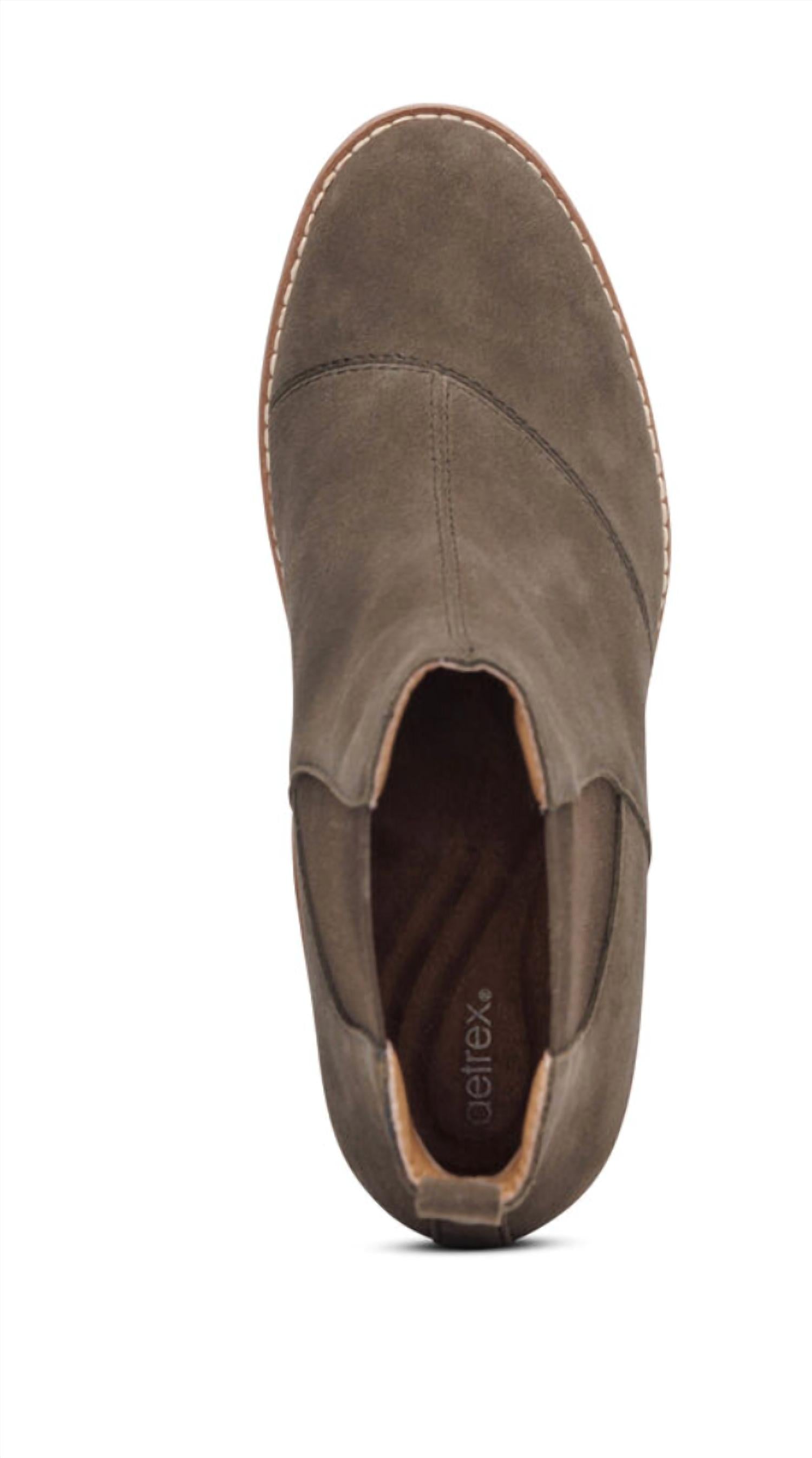 A stylish boot with a comfortable fit and the perfect amount of height. These classic boots are the perfect addition to any outfit and can be worn season after season. Step into the fusion of comfort and style with the Women's Dawn Wedge Boot by Aetrex. These ankle boots in Dark Olive feature a weather-friendly genuine leather upper and ultra-light cork midsole, offering a blend of functionality and fashion-forward design. With dual side ankle stretchy gore material and pull tabs, they promise easy on/off wear. Enjoy the durable rubber outsole and a 2.75” wedge heel, making them perfect for a day at a music festival.