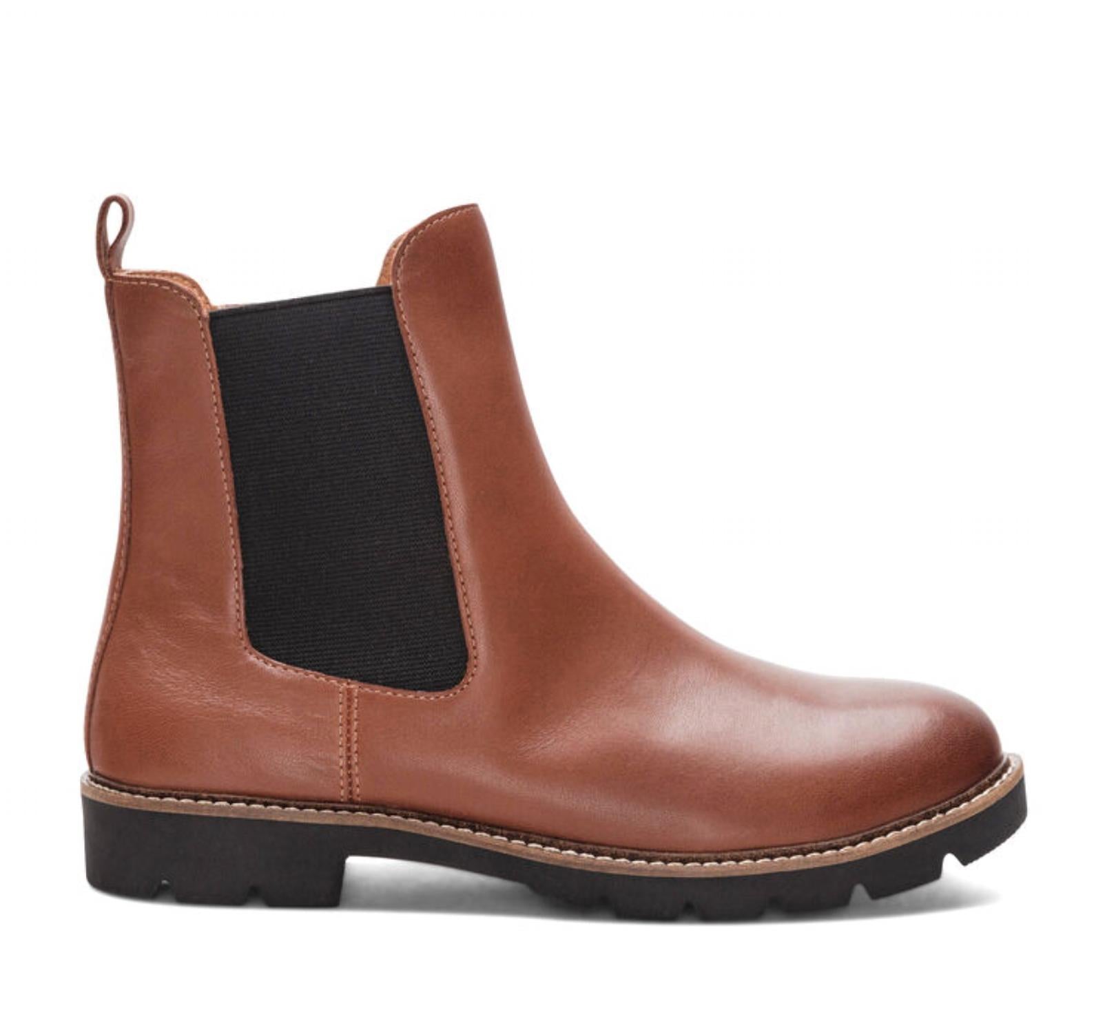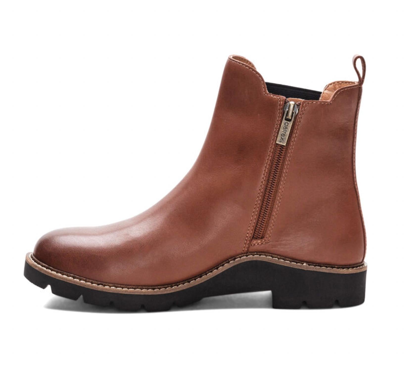 Say hello to the perfect, most versatile boot. The ankle height makes this style easily transition from day to night. Wear them with your favorite skinny jeans and tee for a more laid back look, or pair them with your favorite mini dress and jacket for a night out on the town. Introducing the Women's Hannah Boot by Aetrex, a durable yet stylish choice in cognac designed for urban and outdoor adventures. Made from weatherproof leather, this boot features a medial side zip and an adjustable cross ankle quarter strap for a personalized fit. The round toe and low flat heel (1 1/4"-2") ensure comfort and stability while maintaining a minimalist aesthetic. Ideal for fall and perfect for a music festival, these boots are anatomically designed using data from over 50 million global foot scans.