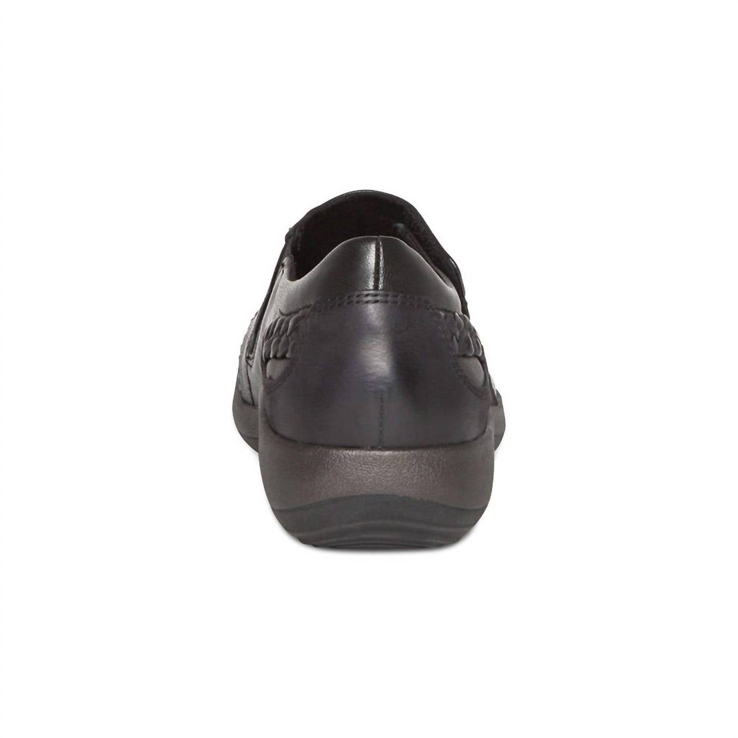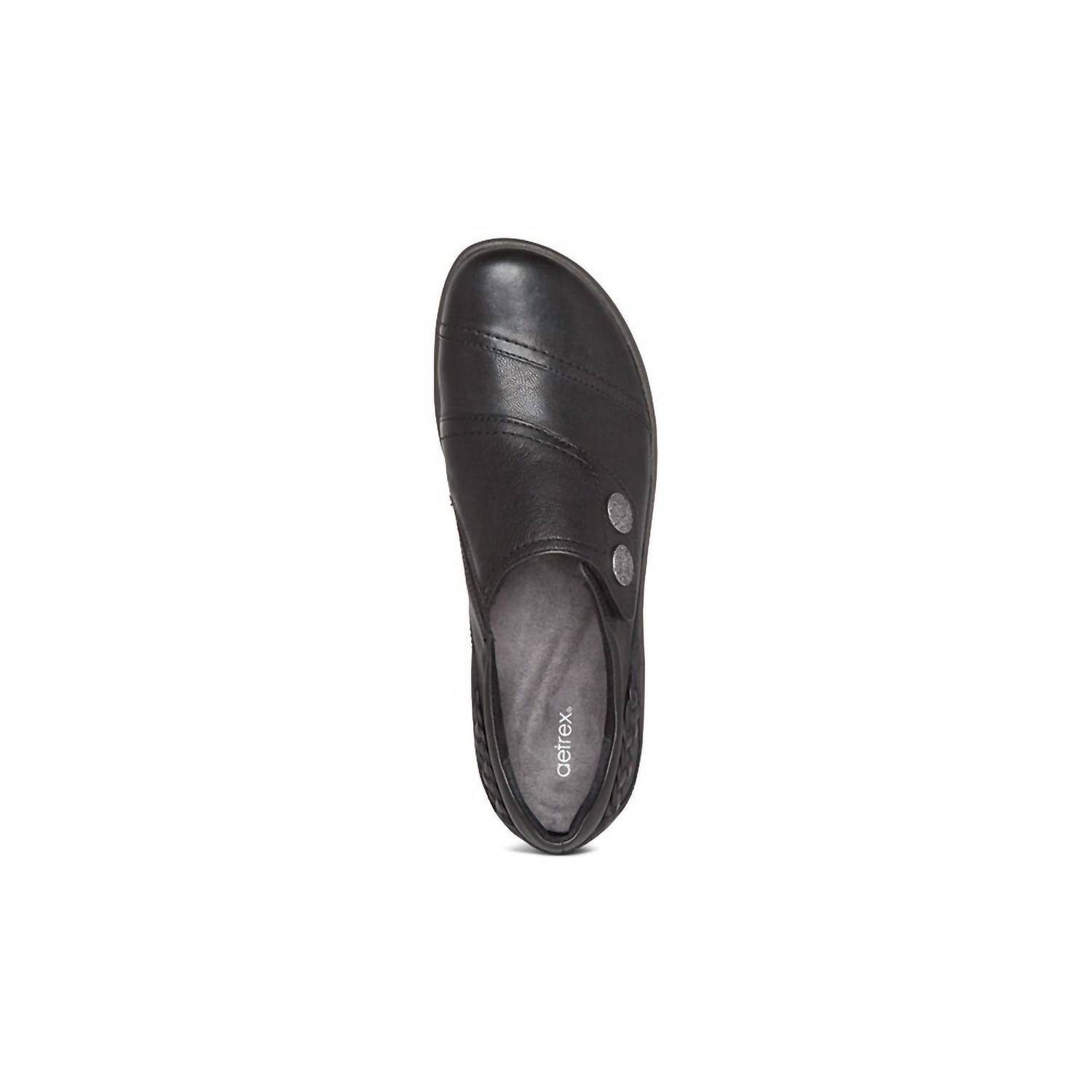 Elevate your footwear collection with the Aetrex Karina Loafer Shoe, a sophisticated black leather design ideal for summer and perfect for Thanksgiving or vacation wear. These stylish flats showcase braided details and decorative buttons, complemented by a round toe and a low 1.3" flat heel for an on-trend 90s fashion vibe. Experience exceptional comfort through the built-in Aetrex Orthotic System, with arch support reducing common foot pains and a memory foam foot-bed offering plush cushioning. The shoe secures with an adjustable hook and loop monk strap closure, and its lightweight EVA foam midsole and rubber outsole ensure durability and stability.