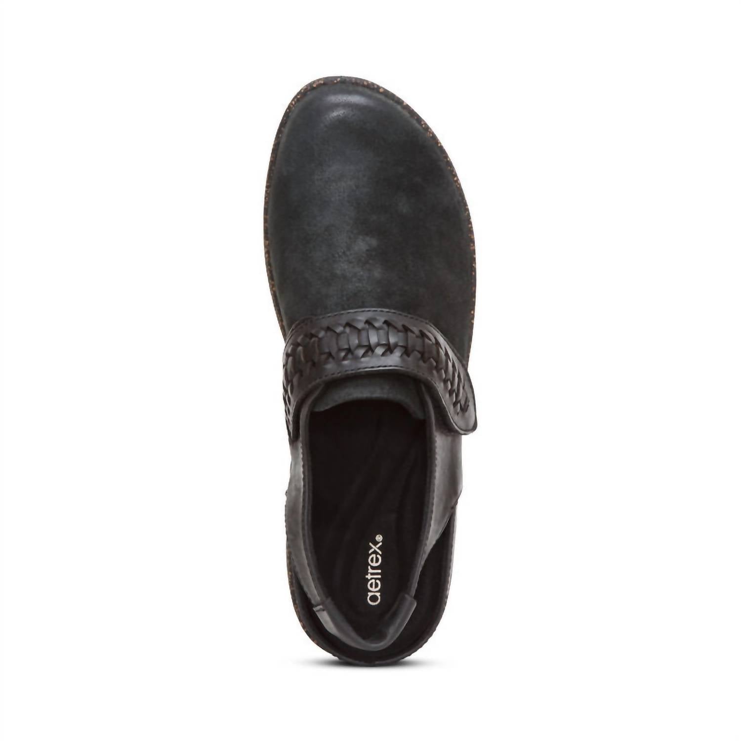 Slip them on and go! Discover the Women's Leni Slingback Clogs by Aetrex, a perfect blend of comfort and style for your streetwear collection. These black clogs are crafted with genuine leather and nubuck, complemented by lightweight rubber outsoles and a wedge heel. Designed with an adjustable strap and slingback fit, they boast advanced technology for odor relief, UltraSky cushioning for pressure relief, and arch support for foot stability. Removable insole included.