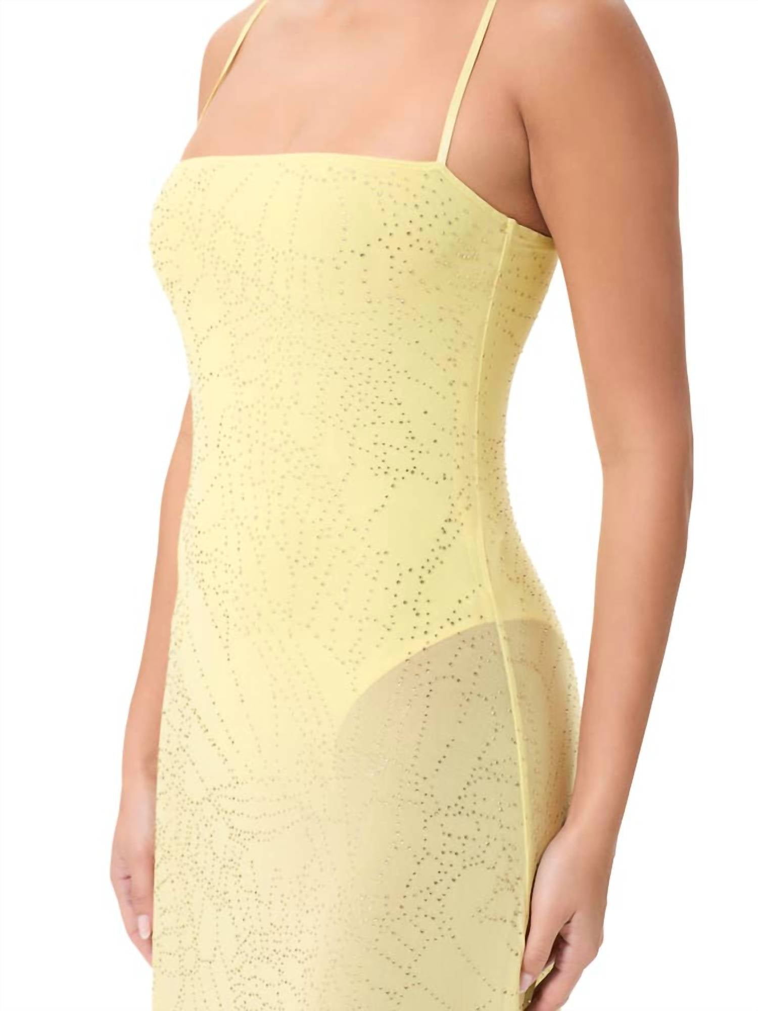 Introducing the Shea Rhinestone Sheer Maxi Dress by AFRM, a stunning choice for any occasion. This elegant dress features spaghetti straps and a sheer, patterned fabrication in a flattering buttercup yellow hue, perfect for summer evenings. Crafted with a fitted silhouette, adjustable straps, and a bodysuit lining for added comfort, it offers a graceful maxi length. Designed with a minimalist trend in mind, this dress effortlessly pulls on with no zip closure required.