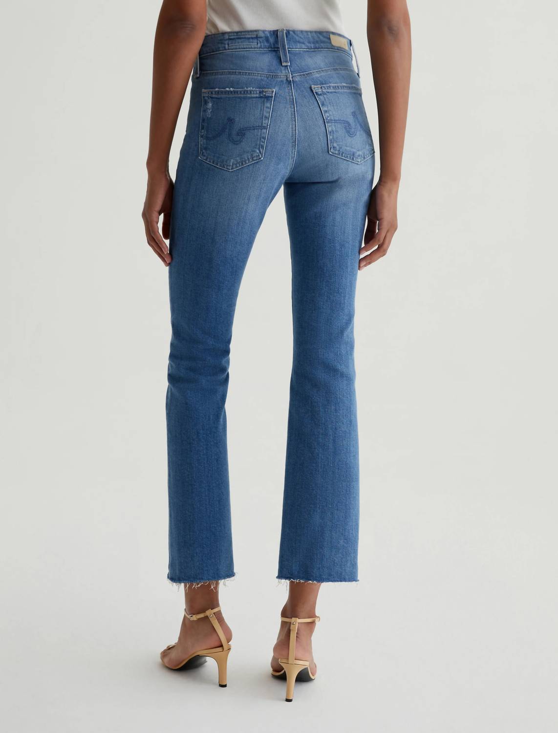 Stay on trend with these stylish boot cut pants that are fit to perfection. The perfect combination of comfort and fashion, you'll be grabbing for these all season long! Introducing the Farrah Boot Crop Jeans by AG Jeans, a stylish addition to any wardrobe with a high-rise fit and solid Iris color. Crafted from a cotton blend, these bootcut jeans are made with 98% cotton and 2% elastane for comfort and flexibility. The cropped design features a 10" rise, 28" inseam, and a leg opening of 18.5", offering a trendy silhouette with a subtly flared shape. With a zip closure and a light denim wash, these jeans are easy to care for—simply machine wash and tumble dry.
