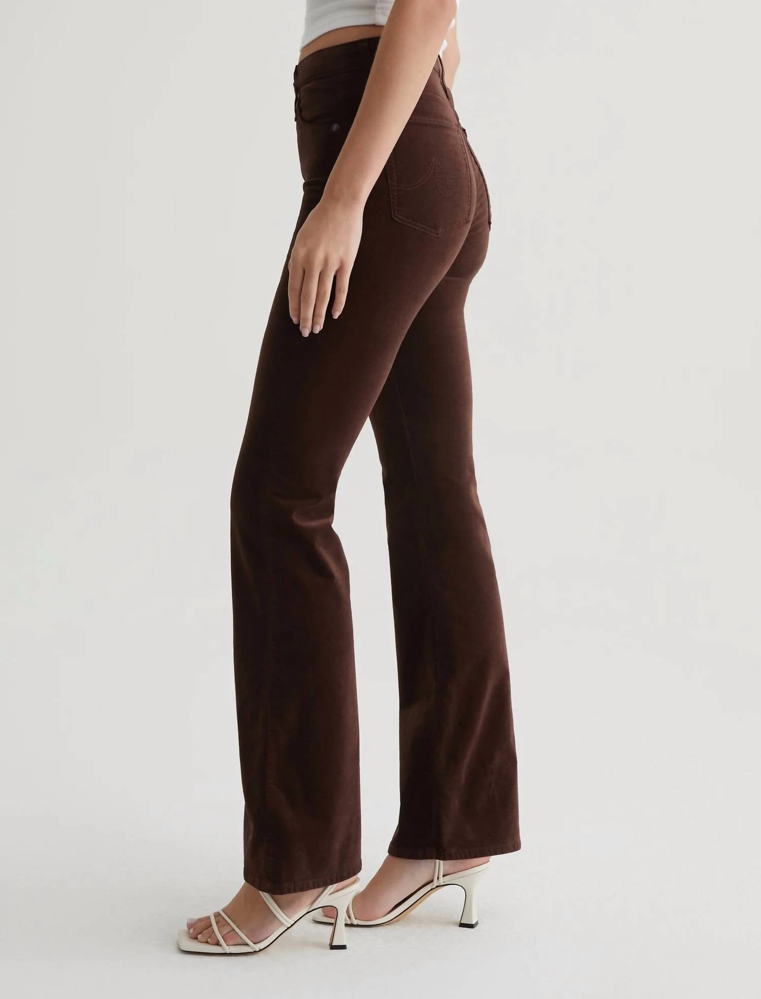 Elevate your wardrobe with the Farrah Boot High Rise Boot Jeans by AG Jeans, designed for women seeking style and comfort. These jeans feature a high-rise waist and a regular straight leg fit, crafted from 7.5 oz. Opulent Stretch Velvet in a solid Bitter Chocolate shade. Made with a cotton blend, this piece ensures a flattering silhouette with a skinny fit through the leg, opening into a subtly flared hem. Closure: Button closure. Care: Machine wash, tumble dry. Key measurements include a 10" rise, 14" knee opening, 18.5" bottom opening, and a 32" inseam.