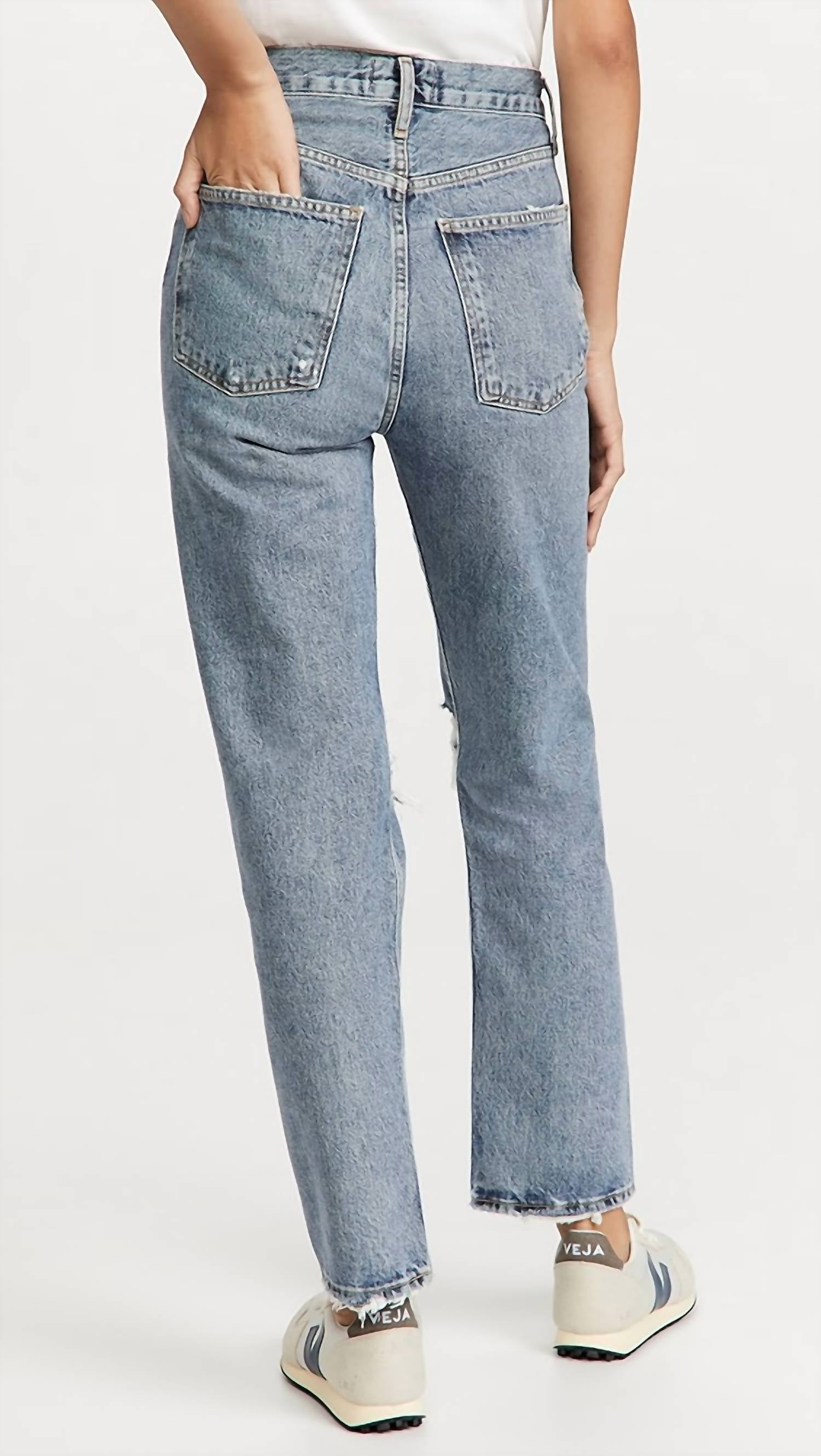 Experience timeless style with the AGOLDE 90's Pinch Waist Ripped High Rise Straight jeans in the color Backdrop. These jeans offer a high-rise waist and boast an ankle-length straight leg design, with distressed detailing at the knees for a touch of edge. Crafted from 100% heavyweight, non-stretch cotton, these jeans promise a comfortable fit and are made in Turkey. Closure: Button fly. Care: Machine wash cold.