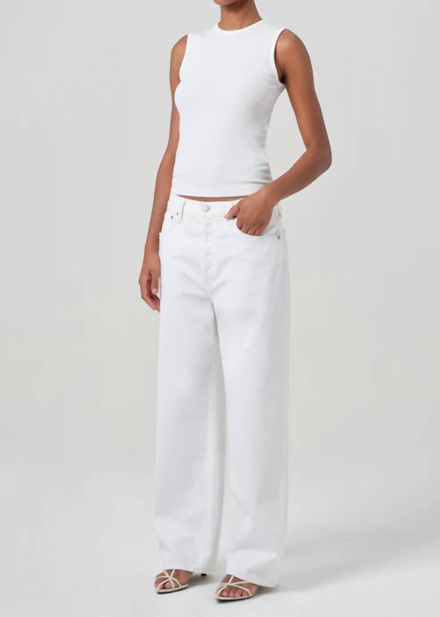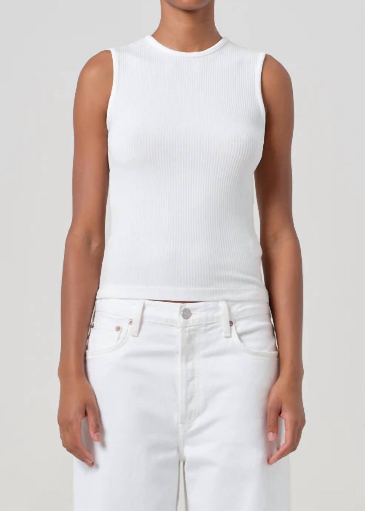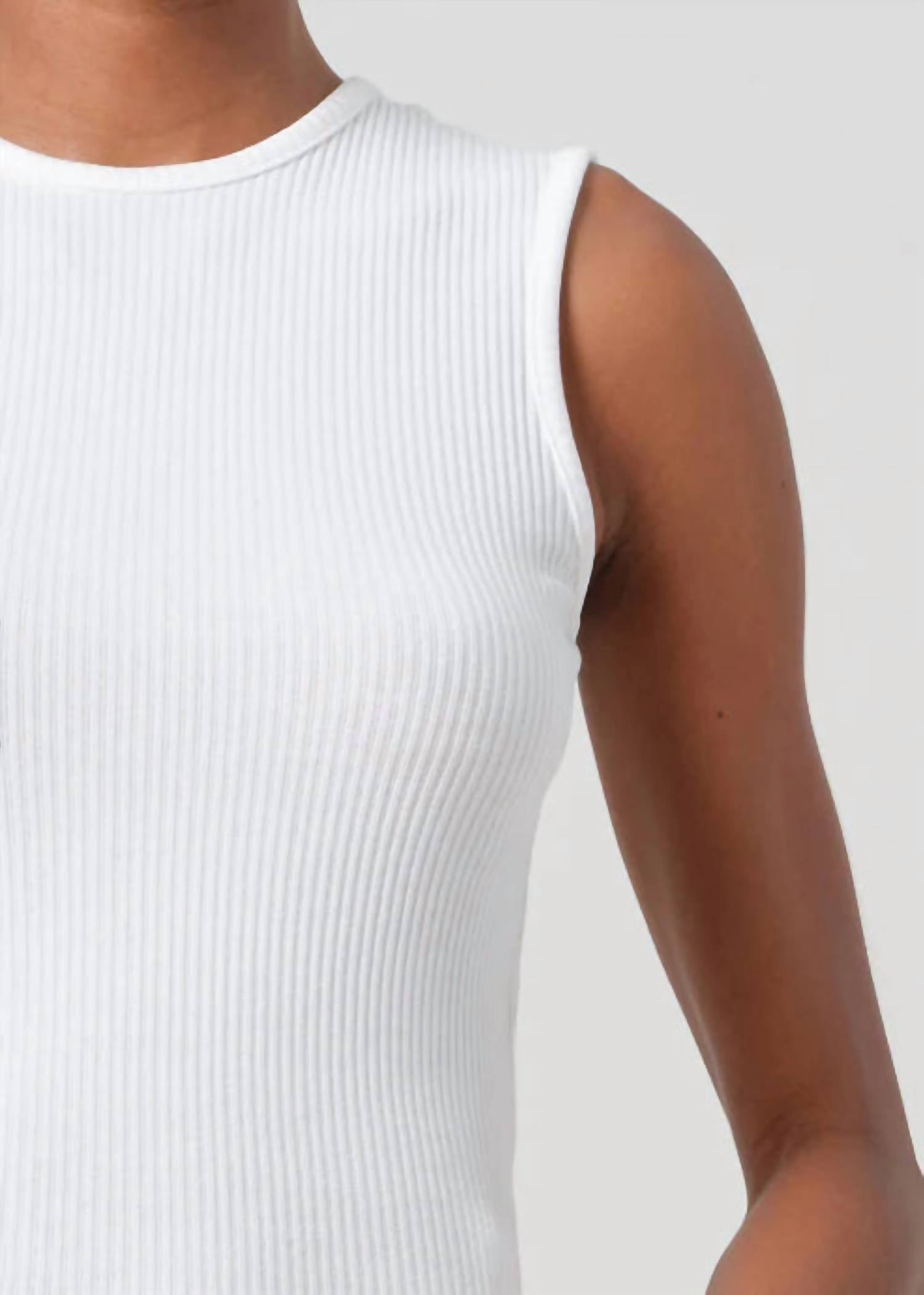 Introducing the AGOLDE Binx Tank, a sleeveless staple with a high neckline and ribbed texture for an enhanced, close fit. Made from 67% Lyocell, 29% Organic Cotton, and 4% Spandex, this white tank measures a body length of 22 inches and offers a flattering shape. Proudly crafted in the USA with imported materials, it features a pull-on closure for easy wear. Care: Machine wash cold inside out with like colors and tumble dry low. Model is 5'10" and wearing a size small.