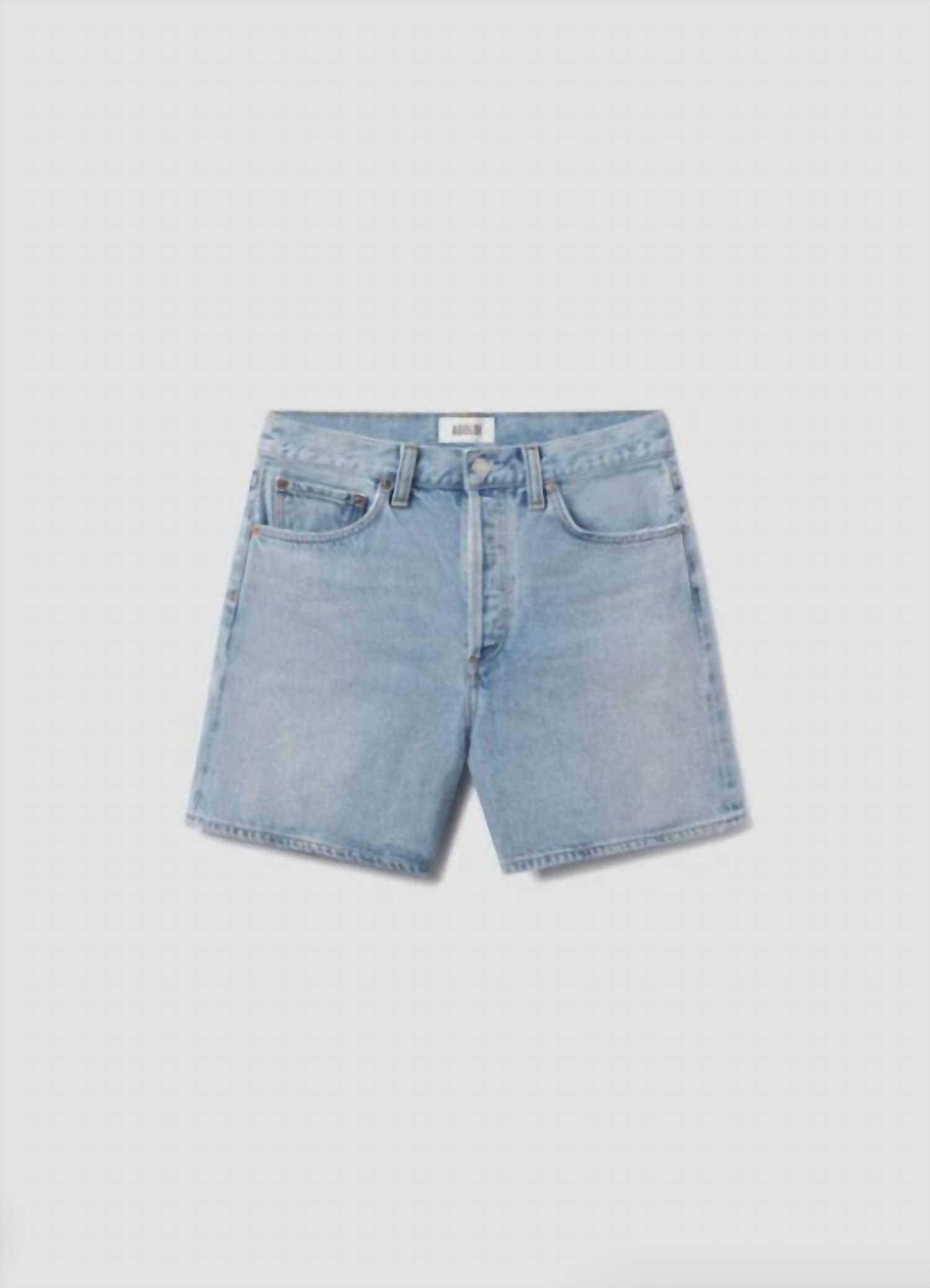 Introducing the Dame Denim Short by AGOLDE, a must-have for your spring streetwear wardrobe. These solid coax jean shorts feature a high-rise fit and a relaxed silhouette with a wide leg opening. Crafted from 100% regenerative cotton, they offer a vintage marbled indigo look and a soft, rigid feel, complemented by a clean hem. Closure: Button fly. Dimensions: Rise 12", inseam 6", leg opening 25 1/2". Care: Machine wash cold inside out with like colors, do not bleach, tumble dry low. Model is 5'10" and is wearing a size 27.