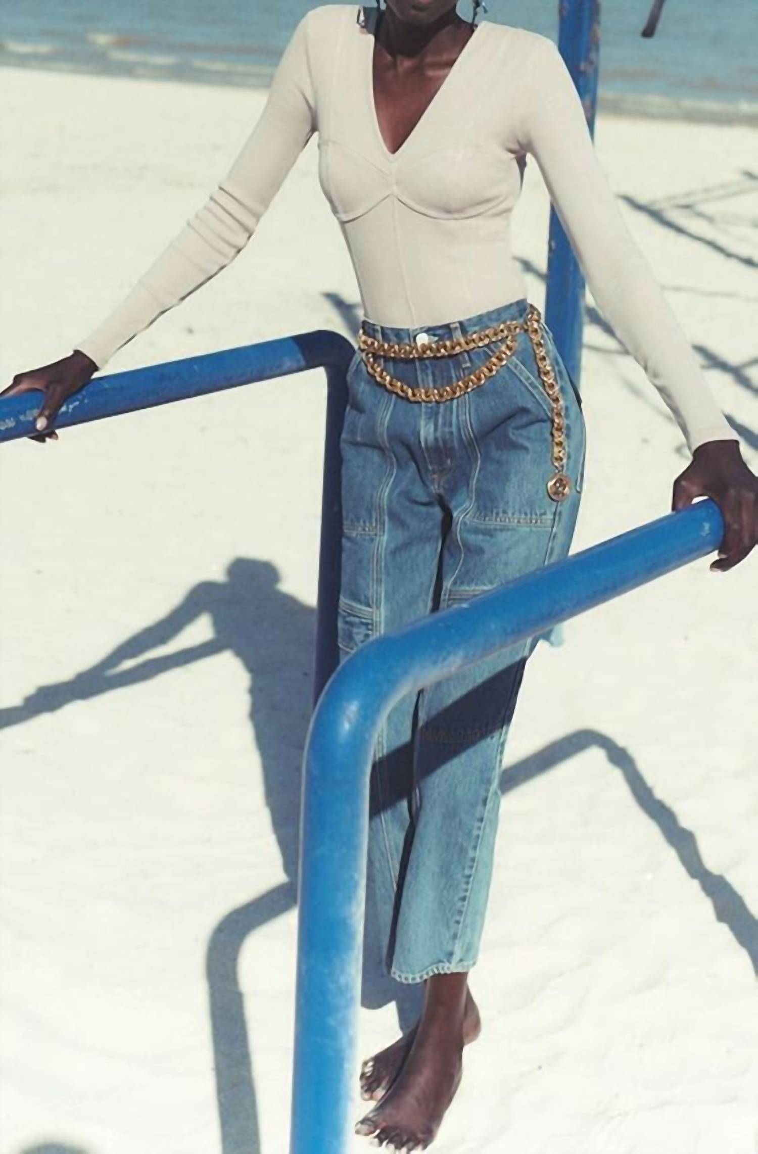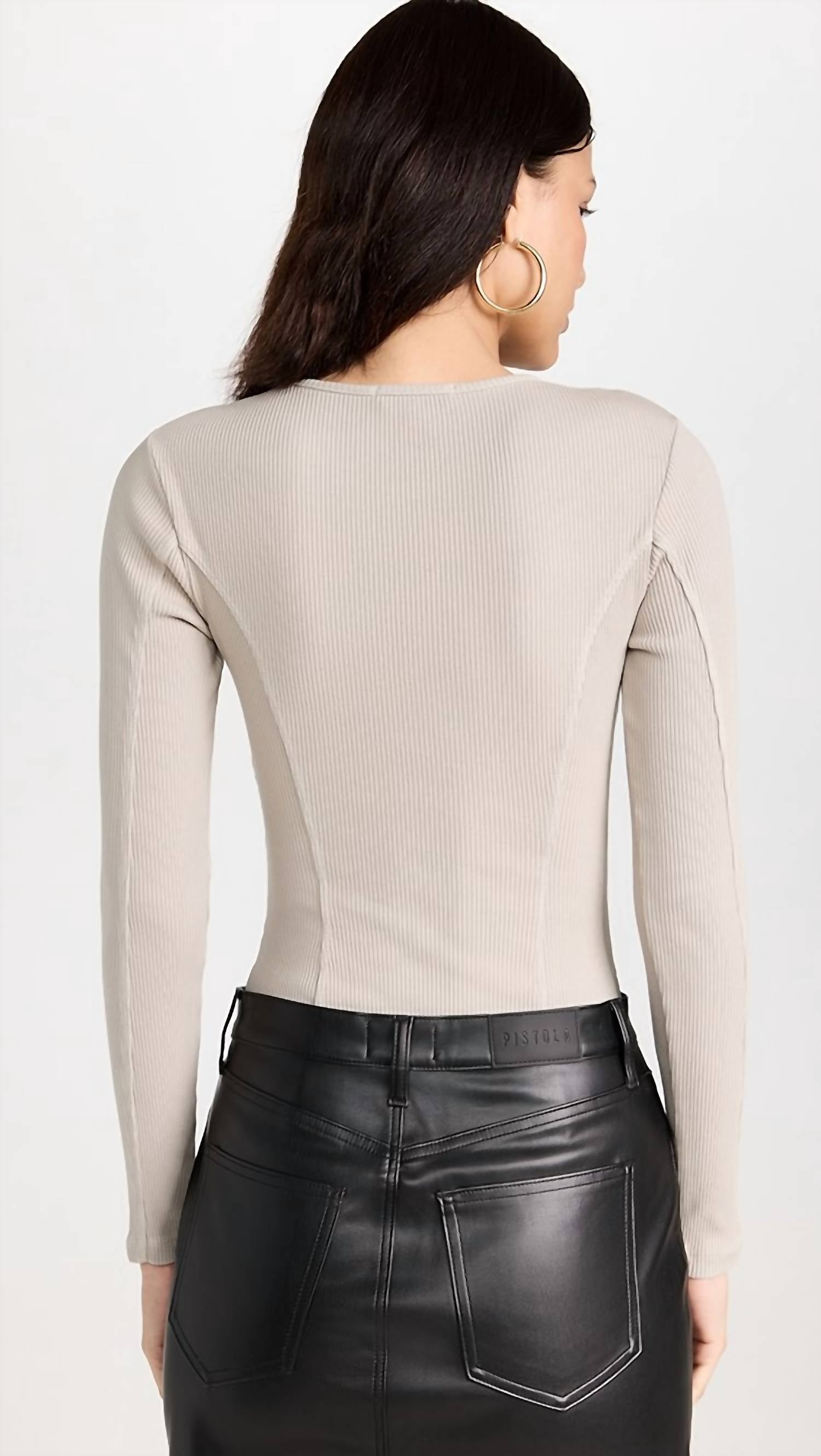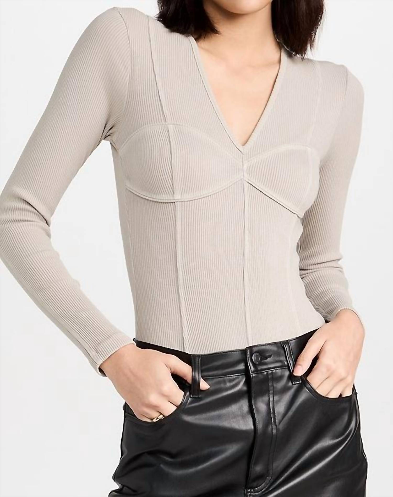 Form fitting and comfortable - this bodysuit check all of the boxes. Introduce a touch of understated elegance to your wardrobe with the Devlin Thong Bodysuit by AGOLDE. Crafted from a luxurious mid-weight ribbed knit fabric, this bodysuit offers a flattering V neck and long sleeves that perfectly balance sophistication and comfort. The distinct raised seams and bandeau detailing at the bodice elevate the overall silhouette and create a subtle yet chic statement. Made in the USA from a high-quality blend of cotton, lyocell, and a hint of spandex, this piece ensures both durability and a perfect fit. Pair it effortlessly with your favorite AGOLDE jeans for a complete and polished look. Thong panty with snap gusset. Shell: 49% cotton/49% lyocell/2% spandex.