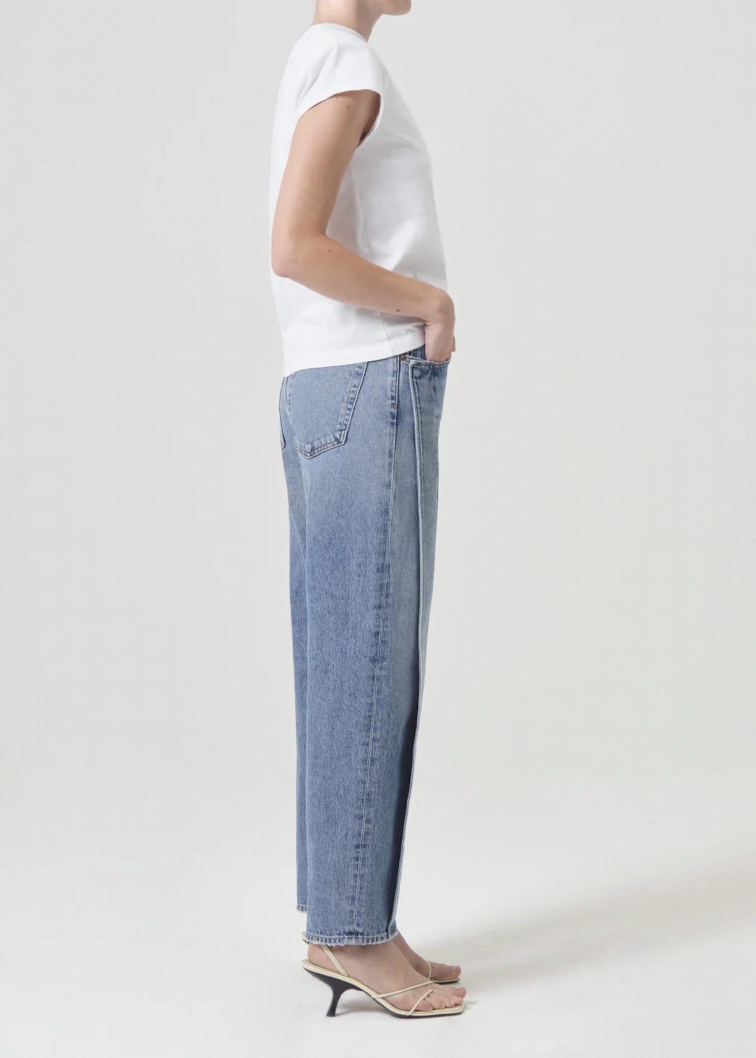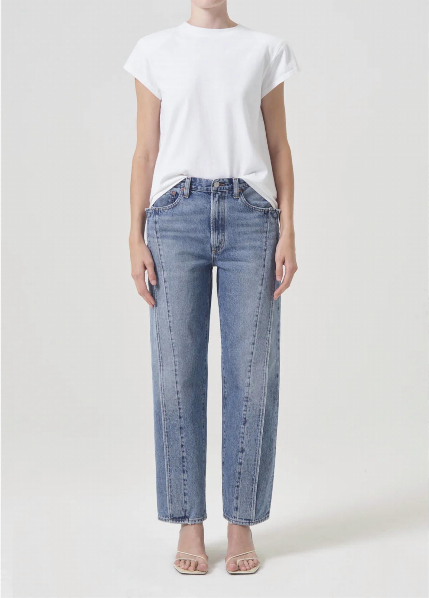 Comfortable and stylish, we love this cropped jean for all of the obvious reasons. Introducing the AGOLDE Fold Jean in the Navigate shade, a chic addition to your denim repertoire. With a flattering high-rise waist and a tapered leg that features an 11.5" rise and 29" inseam, these jeans embrace a retro aesthetic with 80's inspired fold seams. Crafted from 100% regenerative cotton, they promise to soften with each wear while maintaining their shape. Closure: Zip closure. Care: Machine wash cold inside out with like colors, tumble dry low. Model is 5'10", wearing a size 27.