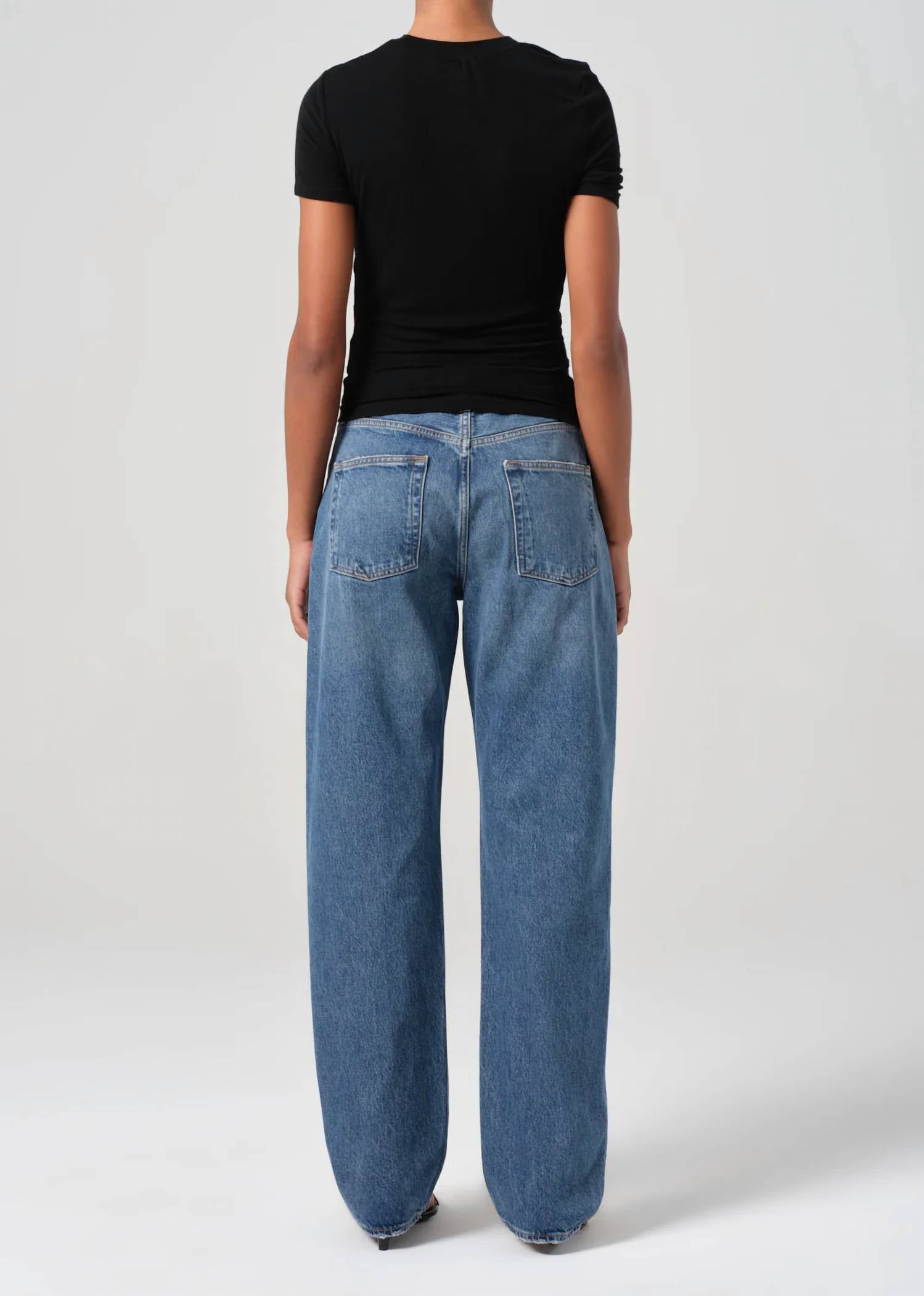 Pair these straight leg jeans with flats, sandals or even heels! You can't go wrong. Meet the Kelly High Rise Jean in Essence by AGOLDE, a chic addition to your denim collection with its striking dark wash. Featuring a flattering high-rise waist, these jeans boast a relaxed fit through the top with a 32" inseam and 11.75" rise, culminating in a sophisticated straight leg. Crafted in Turkey from a denim blend with both regenerative and recycled cotton, it provides a non-stretch, vintage-inspired drape. Complete with a zip closure and functional pockets, the jeans are easy to care for with machine wash and tumble dry instructions.