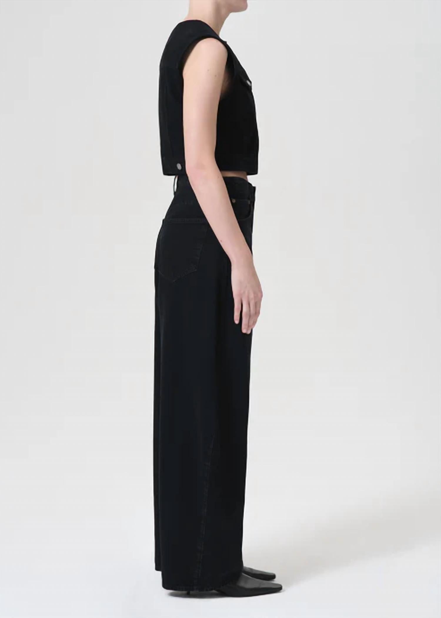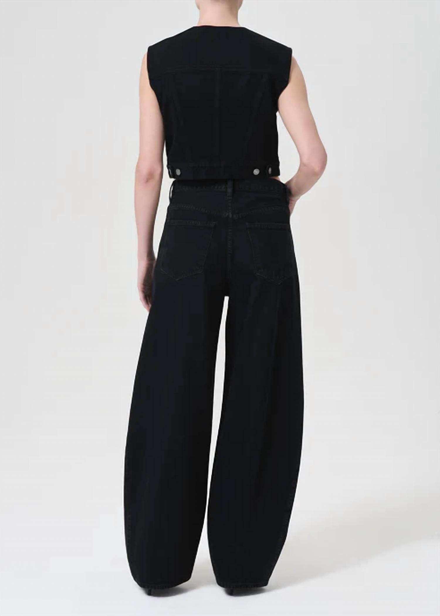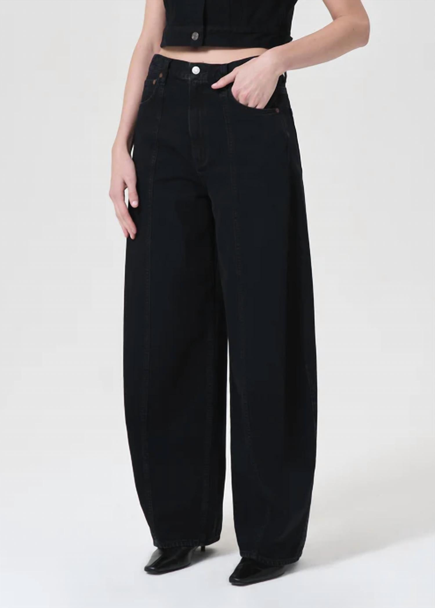 A flattering silhouette that's suprisingly versatile. Introducing the Kristen Jean by AGOLDE, a modern classic designed for the minimalist trend. These wide-leg jeans boast a voluminous high rise of 11.25", accentuated with statement curves and center panel seams for a sleek silhouette. Made from 100% regenerative cotton, they offer a saturated black finish with marbling and will grow softer with each wear. Closure: Zipper fly. Care: Machine wash cold inside out with like colors, tumble dry low. Made in the USA with imported materials, these jeans promise both style and comfort for the fall season. Model is 5'10" and wearing size 27.