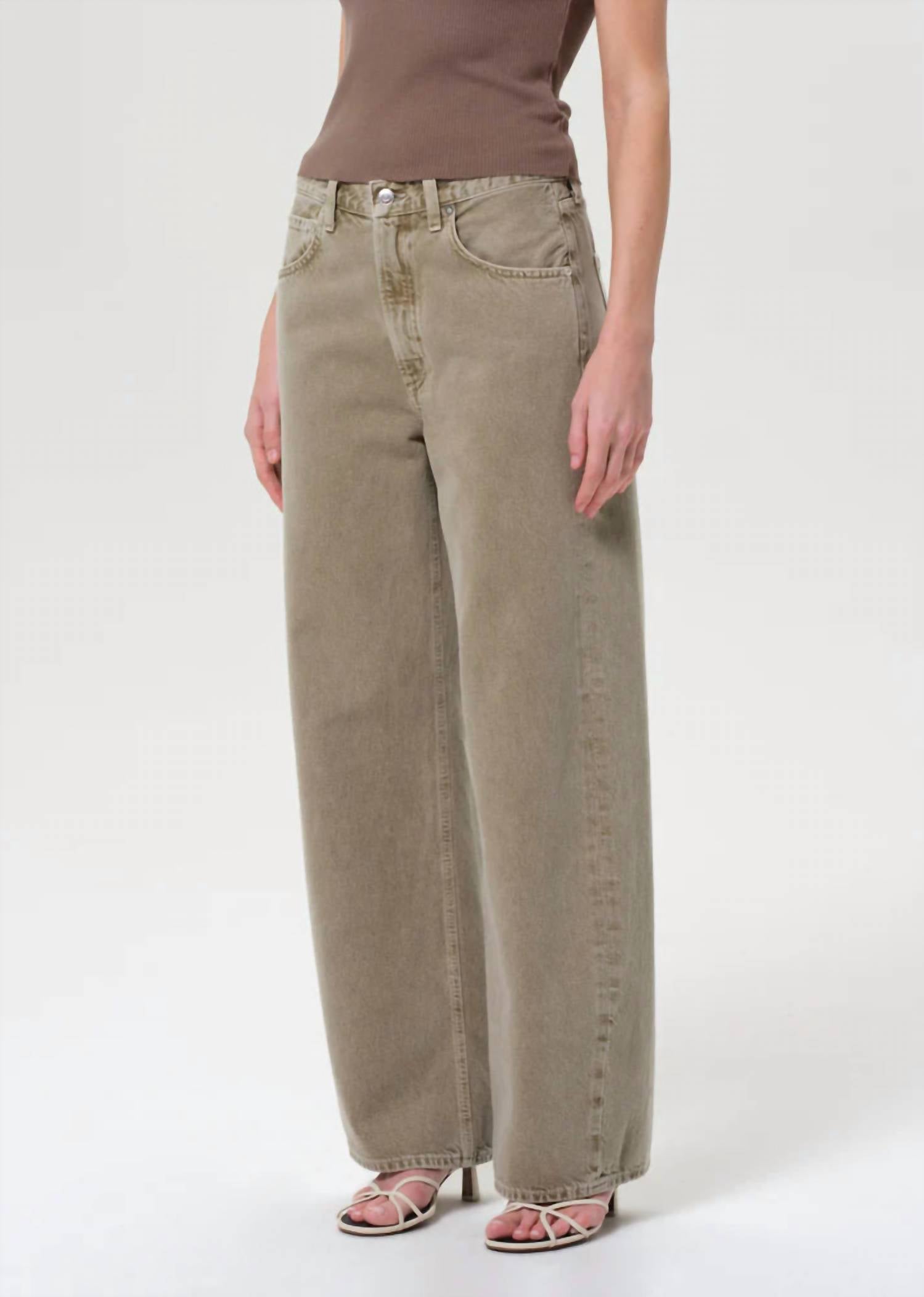 These must-have jeans are fit to perfection. Discover the AGOLDE Low Curve Jeans, a stylish embodiment of 90s fashion with its relaxed fit and light dusty sage denim wash. Made from 100% regenerative cotton, these jeans feature a mid-rise fit with an 11.25" rise, a unique curved outseam, and a gentle taper for a modern silhouette. The jeans are finished with a practical zipper fly closure and designed with pockets for added convenience. Crafted in the USA with imported materials, they're machine washable with like colors and can be tumble dried on low for easy care. Model is 5'10" and is wearing a size 27.