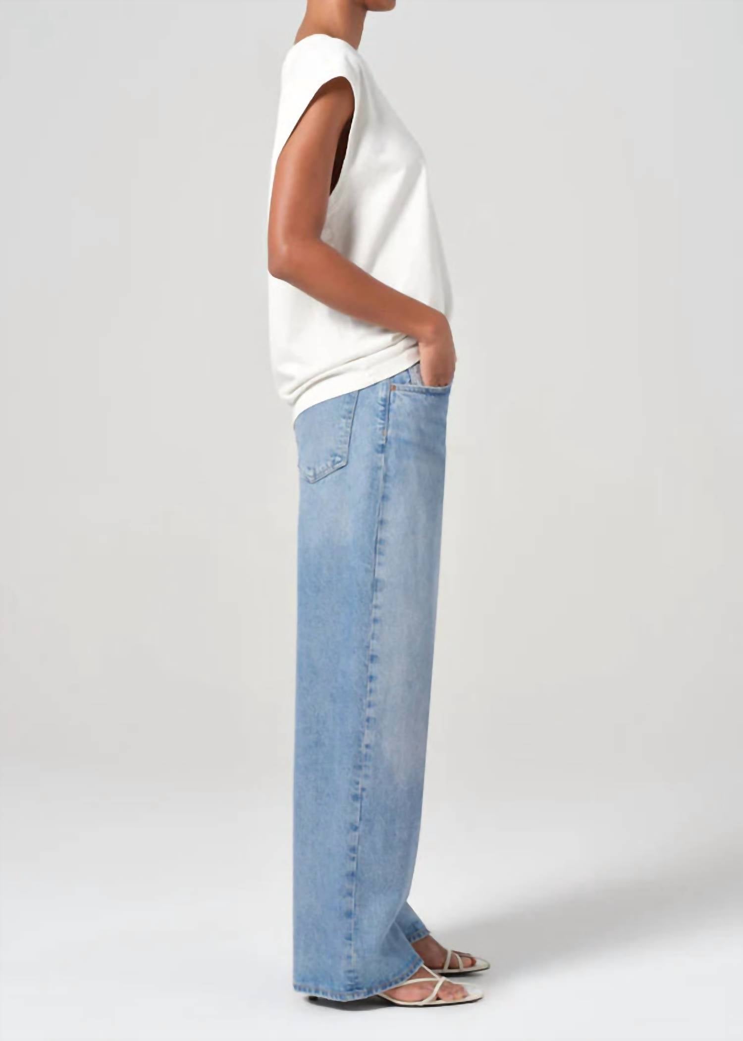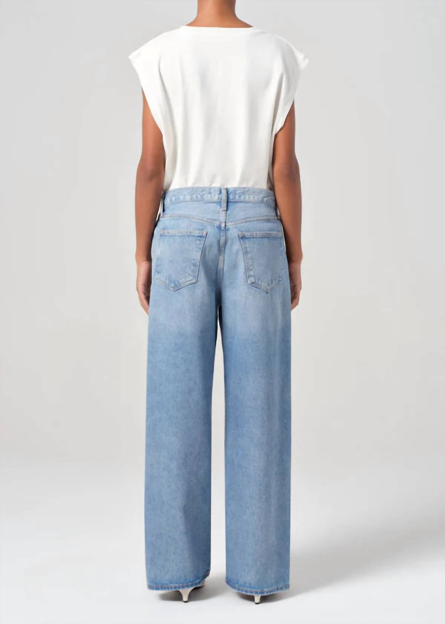 Pair these straight leg jeans with flats, sandals or even heels! You can't go wrong. The AGOLDE Low Slung Baggy Jean in Libertin is a stylish choice for women seeking both comfort and a trendy look. Featuring a high-rise waist with a relaxed fit, these straight-leg jeans showcase a directional baggy silhouette with a rise of 12.25 inches and an inseam of 30.5 inches. Crafted from a sustainable cotton blend of 67% organic cotton, 25% recycled lyocell, and 11% recycled cotton, they offer zero stretch with a soft hand feel. Closure: Button closure; Care: Machine wash cold inside out with like colors, tumble dry low. Ideal for fall and workwear occasions, this piece adds a sartorial twist to any wardrobe.