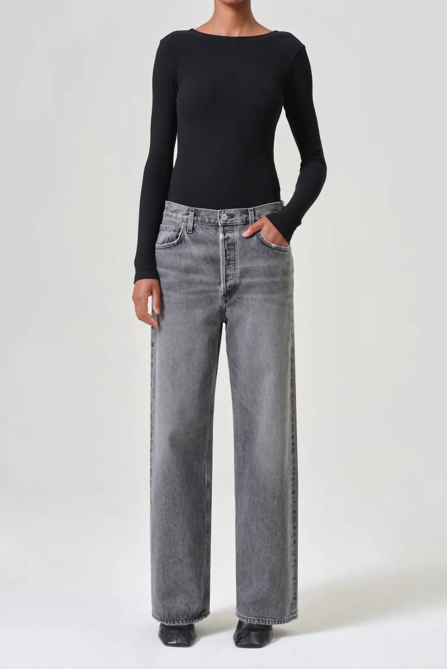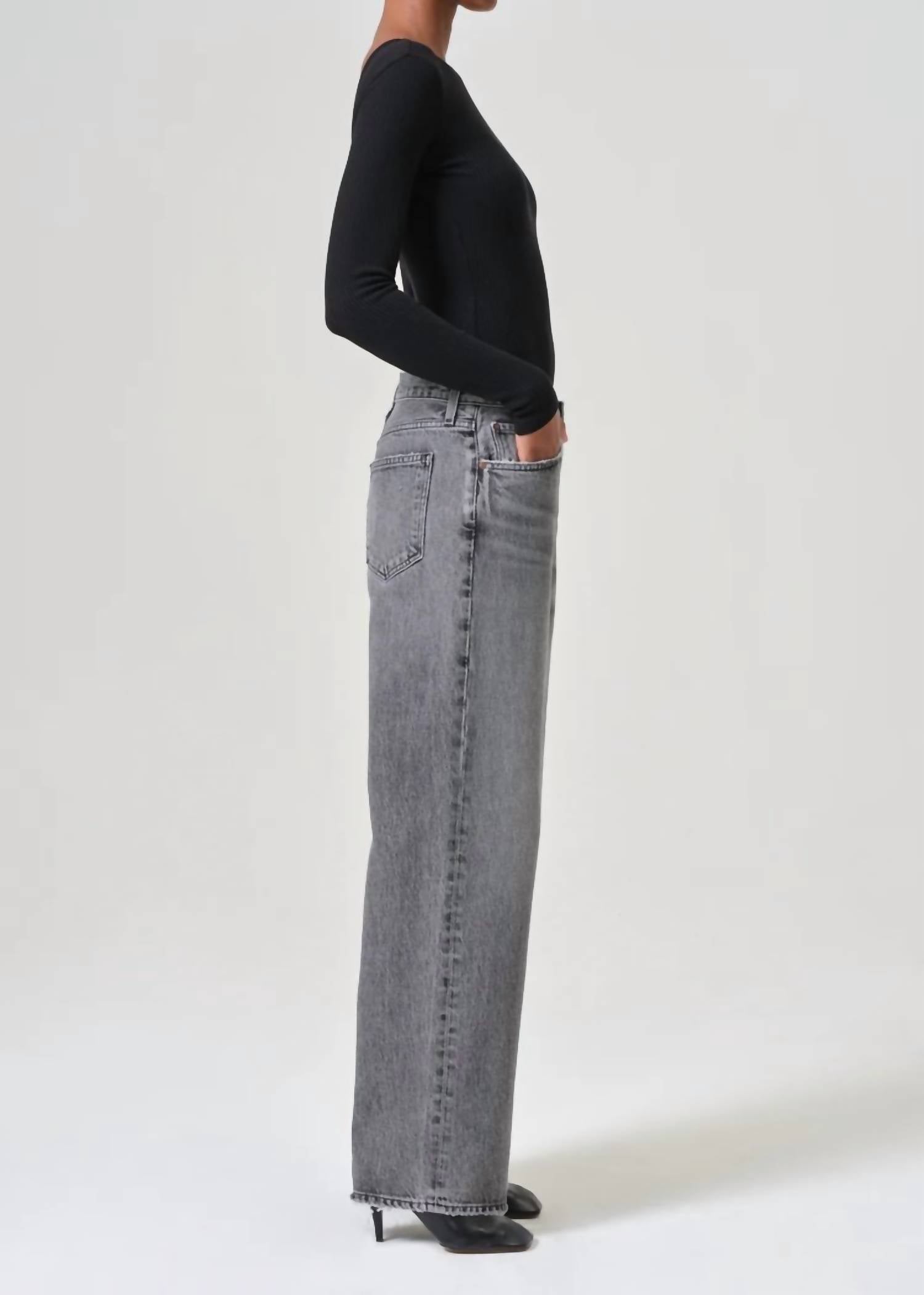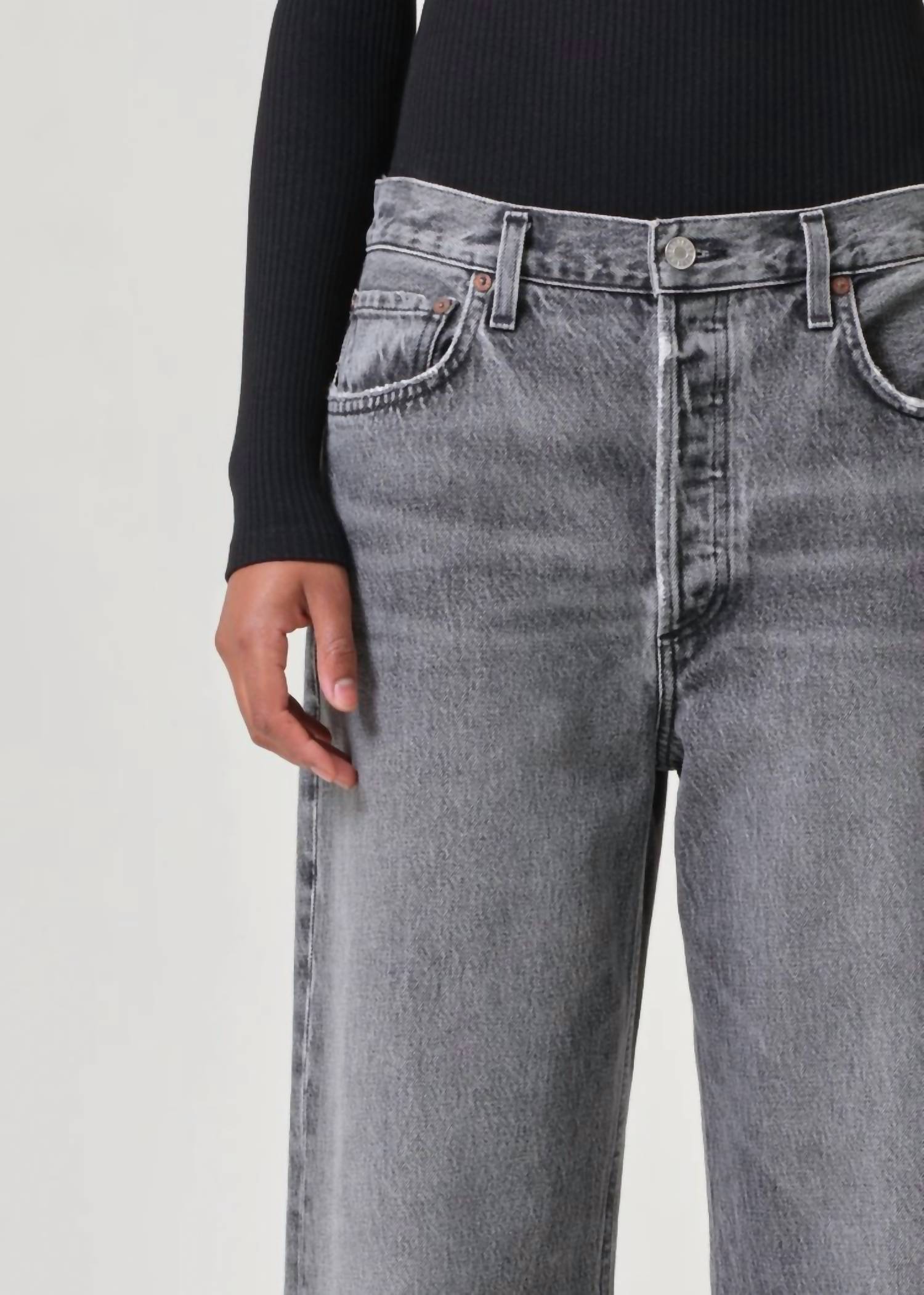 Discover the AGOLDE Low Slung Baggy Jeans in Spirit, an embodiment of both comfort and style with a trendy streetwear vibe. These jeans boast a baggy, wide-leg design with a 30.5" inseam and low-rise fit, intentionally designed to sit effortlessly on the hips. Crafted from 100% regenerative cotton, they feature a classic button fly closure and a practical 5-pocket design. Made in the USA, these jeans combine eco-friendly materials with machine-washable convenience for easy care, making them a perfect addition to your Back to School wardrobe. Model Dee, standing 5'5" with a 34" chest, 27" waist, and 38" hip, wears size 25.