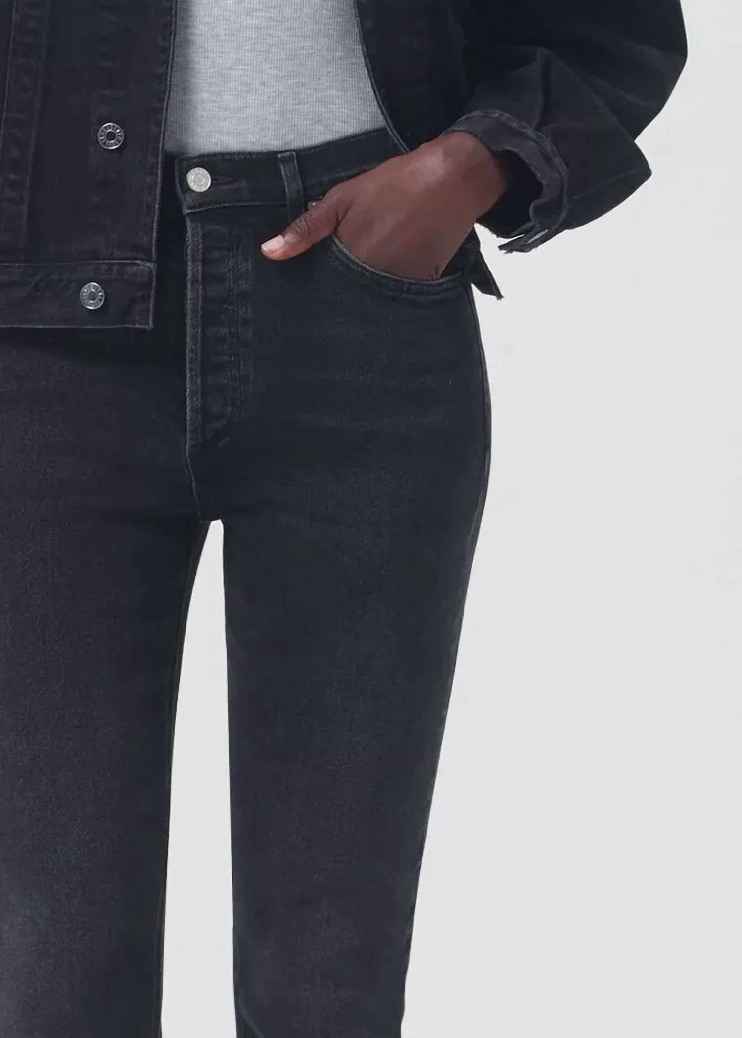 The Nico High Rise Slim Fit jeans by AGOLDE offer a sleek and modern silhouette in classic black. These jeans are crafted from a blend of 96% organic cotton, 3% polyester, and 1% elastane, ensuring comfort and durability. Featuring a high rise of 11.25 inches and a 27-inch inseam, they have a skinny leg style with an 11.5-inch opening. Designed for easy care, simply machine wash inside out to maintain their solid look and feel.