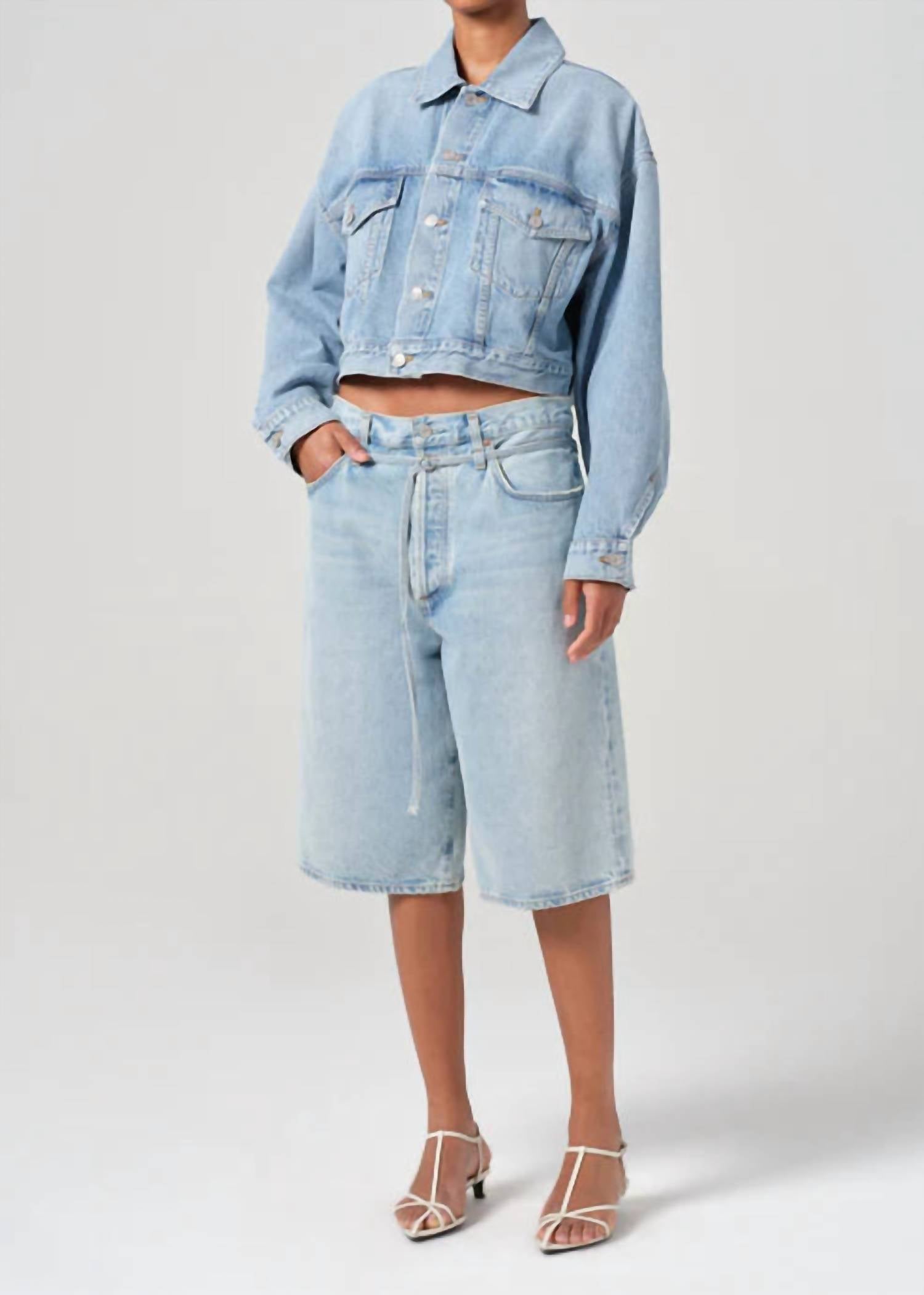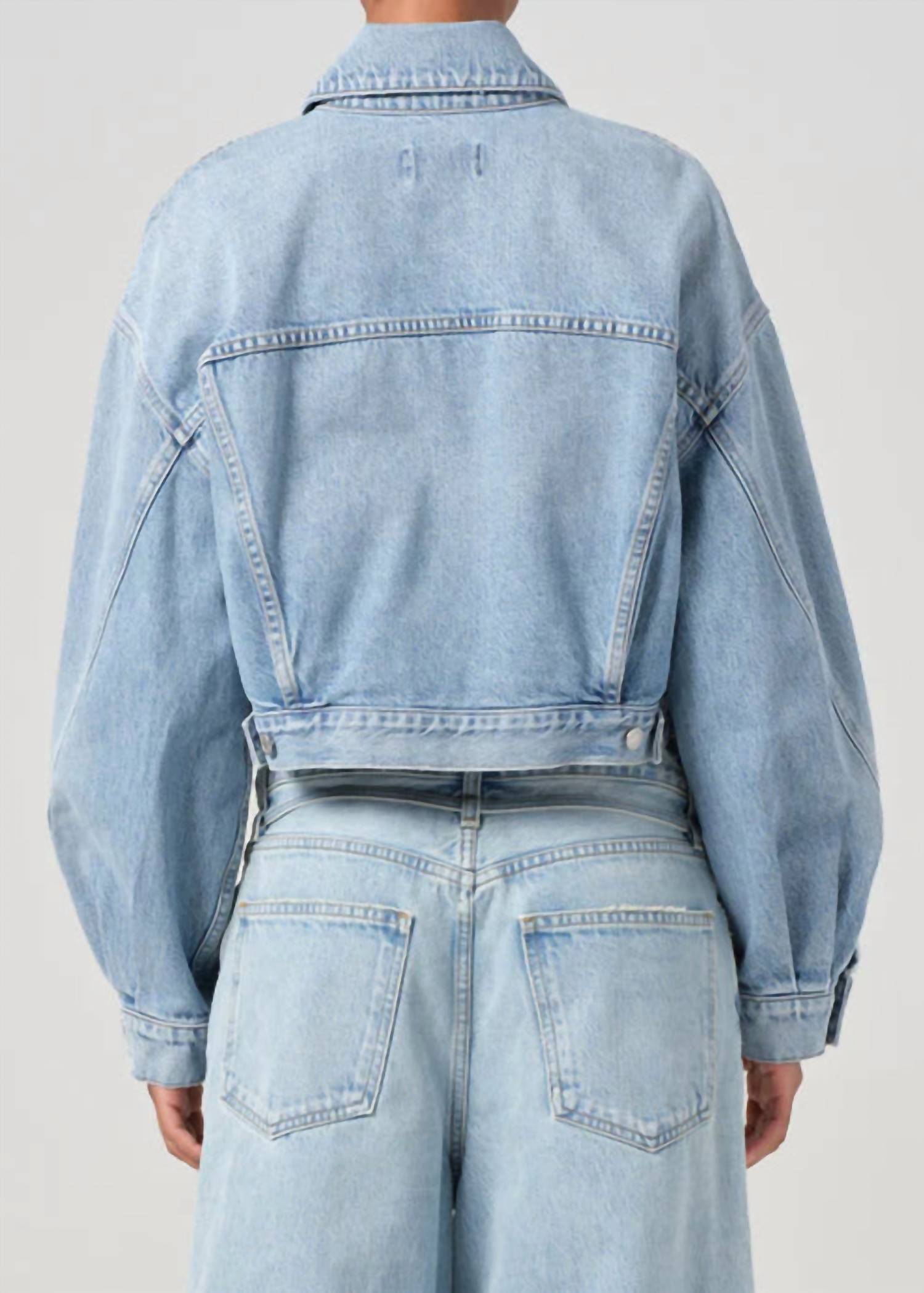 Throw this adorable jacket over just about anything for an effortlessly stylish look. Discover the AGOLDE Palmer Jacket in a unique 'Space' shade, offering an updated take on a classic jean jacket. This piece features long, low exaggerated balloon sleeves and a subtle cropped body measuring 20.5 inches in length. Designed from 100% regenerative cotton, the jacket is as eco-friendly as it is stylish. Button closure. Machine wash cold inside out with like colors; tumble dry low. Model is 5'10" and wearing a size Small.