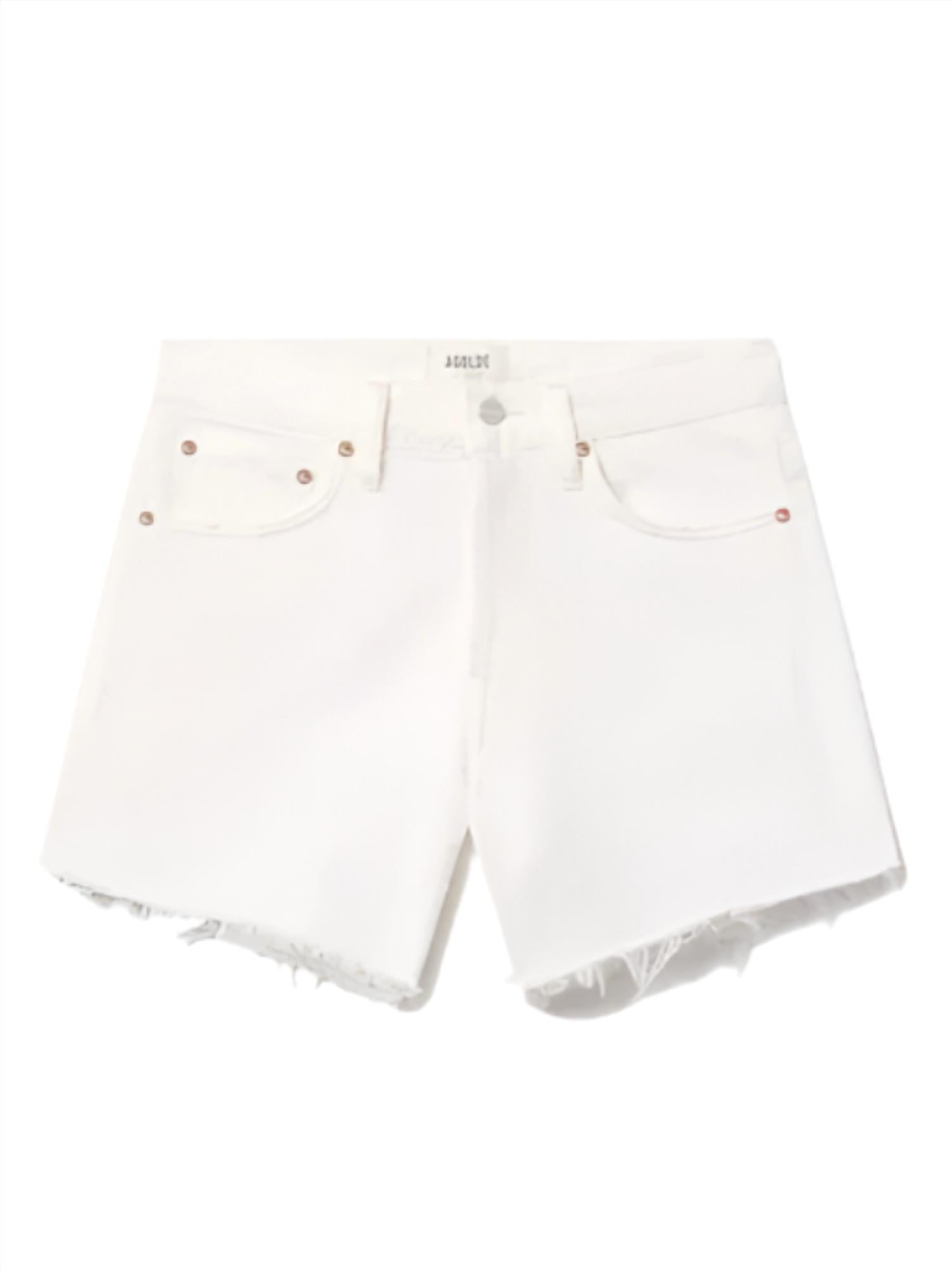 Not only cute but extremely comfortable. The jean shorts you will be reaching for all season long. Introducing the Parker Long Shorts by AGOLDE, a must-have for effortless summer style in a versatile Panna Cotta white. These shorts boast a comfortable high-rise waist and a slightly longer inseam of 4.5 inches, designed for a relaxed fit. Made from 100% sustainable cotton, they feature a button fly closure and practical pockets. Originating from Turkey, these shorts are easy to care for with machine wash cold and tumble dry on low settings, perfect for travel and vintage-inspired outfits.