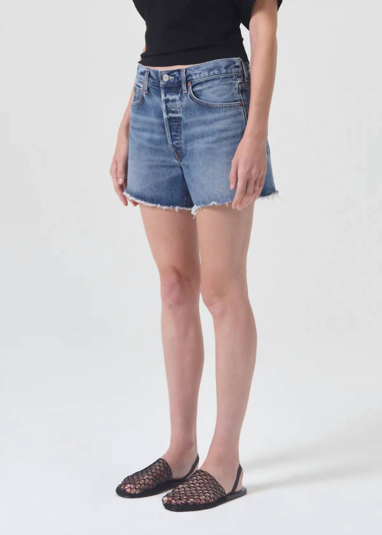 Not only cute but extremely comfortable. The jean shorts you will be reaching for all season long. Experience timeless style with AGOLDE's Parker Long Short in Ruin, a perfect blend of vintage appeal and practicality. These high-rise jean shorts feature a slightly longer inseam of 4.5 inches and a leg opening of 24.5 inches, crafted from 100% non-stretch cotton that softens with each wash. Made in Turkey, they boast a button fly, five-pocket silhouette, raw-edge hems, and silver- and copper-tone hardware. Care instructions: Machine wash, tumble dry. Model wears size 27 (5'10" height, 33" bust, 25" waist, 35" hips).