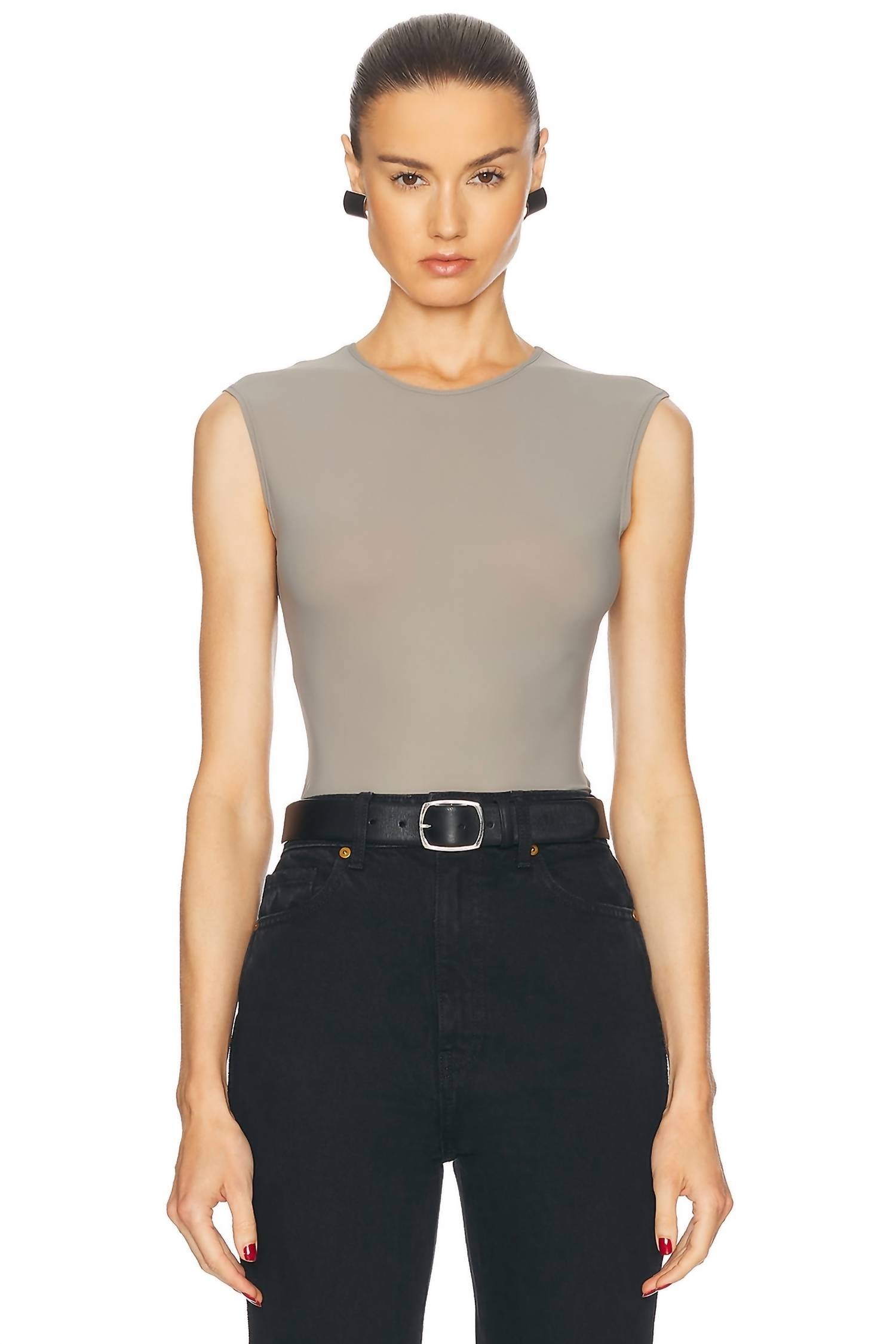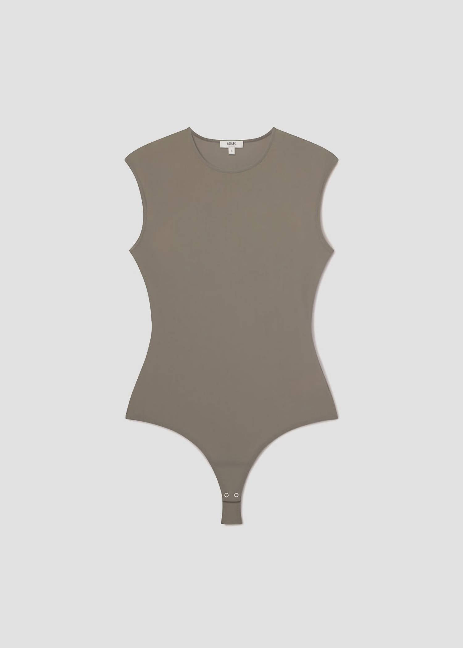 Who doesn't love a good bodysuit? Presenting the Aura Sleeveless Bodysuit by AGOLDE, an essential for the modern woman in a chic aluminum shade. This sleek piece features a crewneck design and is expertly crafted in the USA from a blend of 73% polyamide and 27% elastane, offering a comfortable stretch-jersey fit. It includes a thong bottom with snap closures in the gusset for a seamless look under clothing. Care for this solid pattern bodysuit is straightforward with machine wash and lay flat to dry instructions.