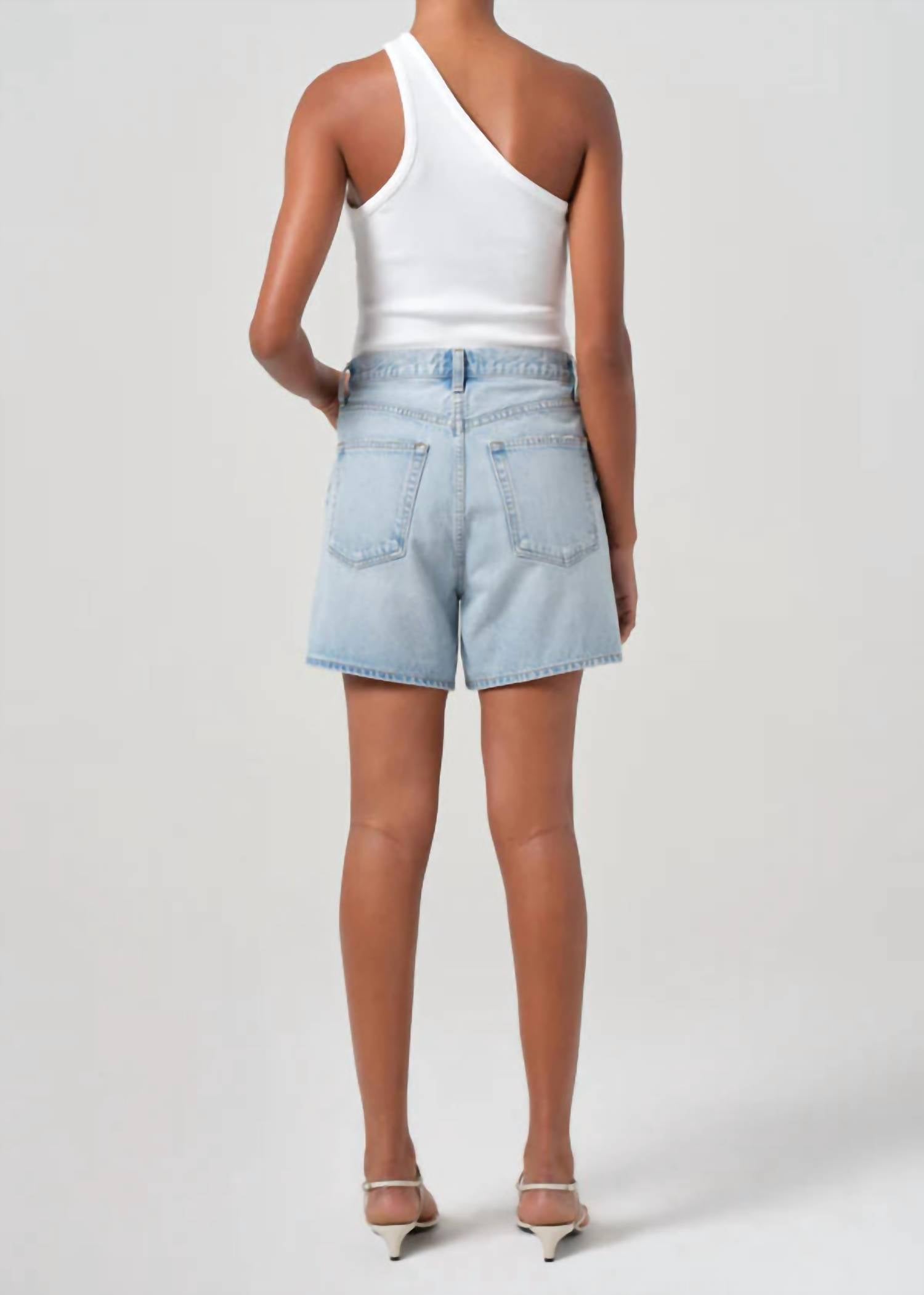 Introducing the V-waist Short by AGOLDE, a stylish choice for your summer wardrobe in a solid BACKBEAT shade. These jean shorts feature a sharp V-waist, providing a trendy streetwear vibe, and are made from a soft Cotton Blend with 67% Regenerative Cotton, 22% Lyocell, and 11% Post Consumer Recycled Cotton. With a button fly closure, the shorts have an 11" rise, a 5 1/2" inseam, and a 24 1/4" leg opening for a polished look. Care is simple with machine wash cold inside out with like colors and tumble dry low. Model is 5'10" and wears a size 27.