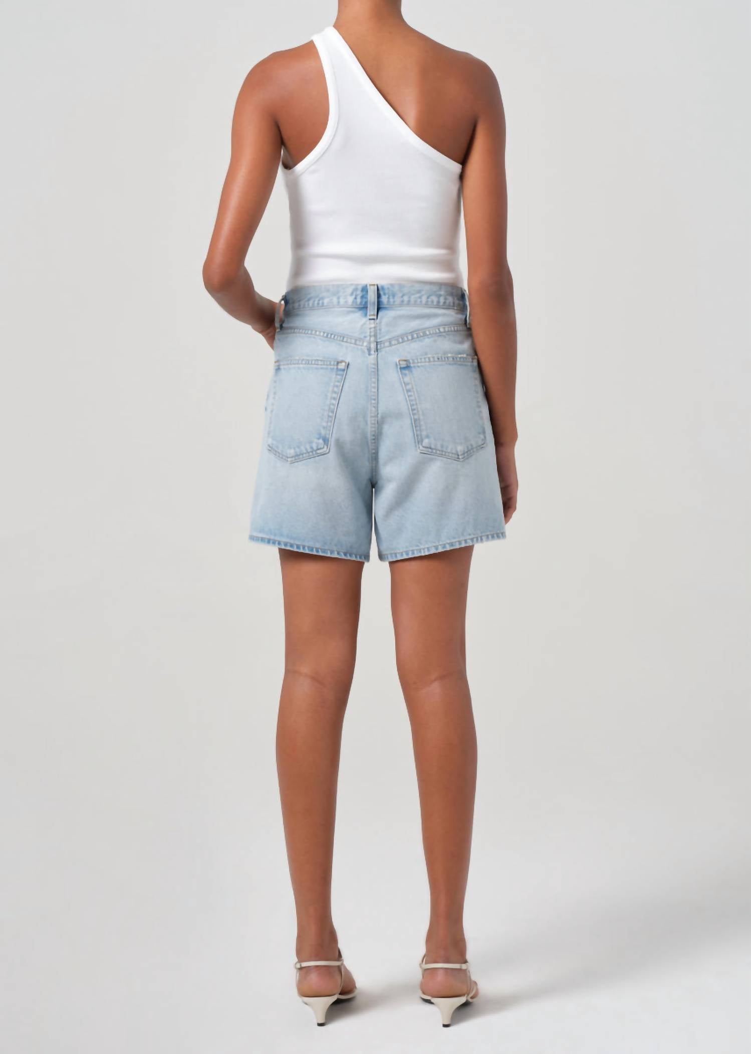 The V-Waist Shorts by AGOLDE in blue offer a modern twist with their sharp, V-shaped waistband, providing a flattering cinch at the waist. Made from regenerative cotton, these textured jean shorts are designed for a relaxed fit through the leg, featuring pockets for functionality. This pull-on style, tailored for women, seamlessly combines structured comfort with a streetwear vibe, perfect for summer outings or holiday parties like Thanksgiving. Whether paired with a simple tee or slouchy shirt, these shorts promise an effortless, elevated look.