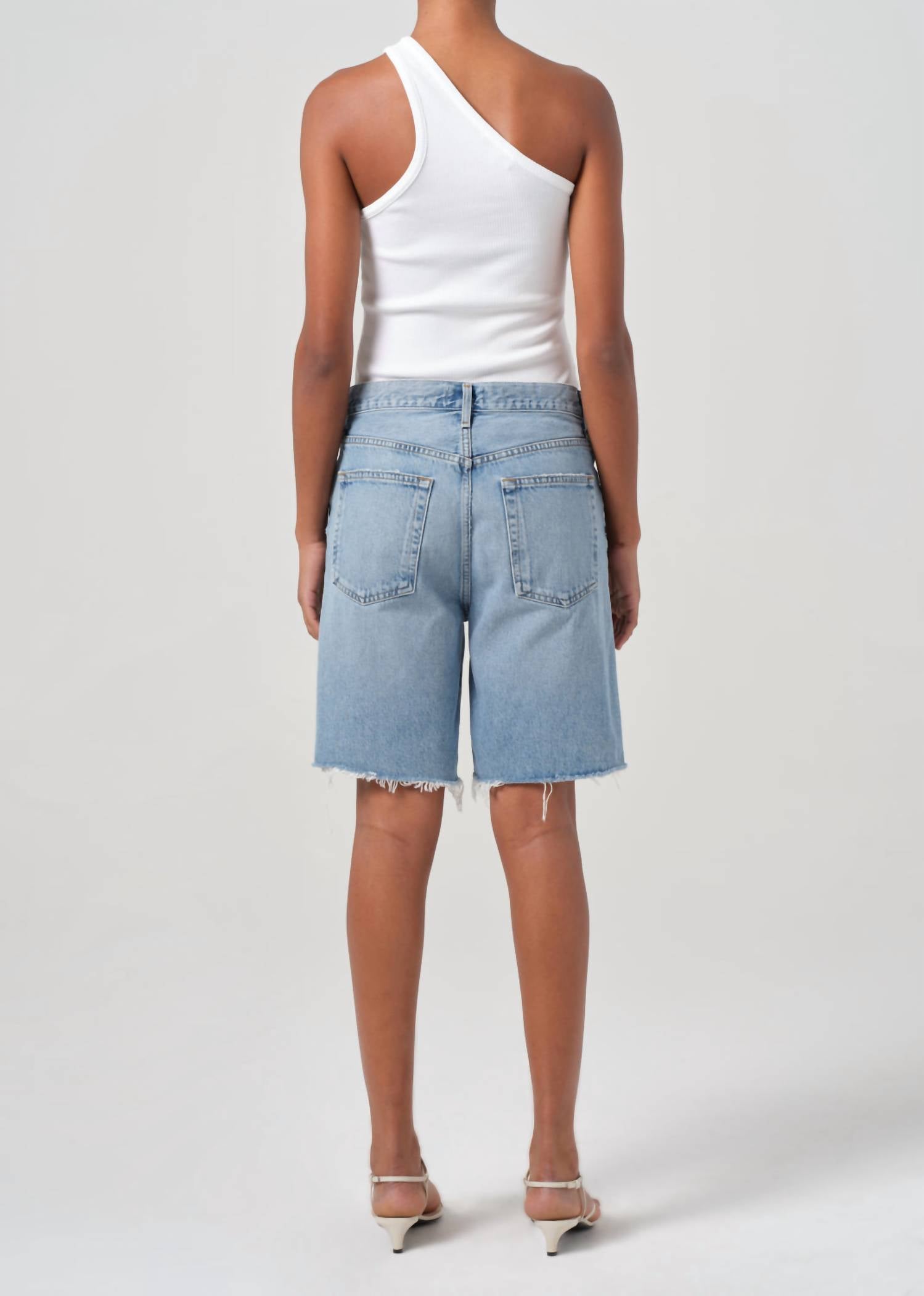 Introducing the Women's 90s Denim Short by AGOLDE, crafted to embody a vintage charm with a modern twist. This aged light indigo short features a 12 1/4" rise and 9" inseam, offering a relaxed fit and hitting just above the knee for a laid-back aesthetic. Made from 100% regenerative cotton, these shorts ensure comfort and durability, complete with a stylish raw hem and texture that showcases subtle fading and whiskering. With a classic button closure and being made in Turkey, they are ideal for carefree summer days. Care: Machine wash cold inside out with like colors, tumble dry low. Model is 5'10" and wearing size 27.