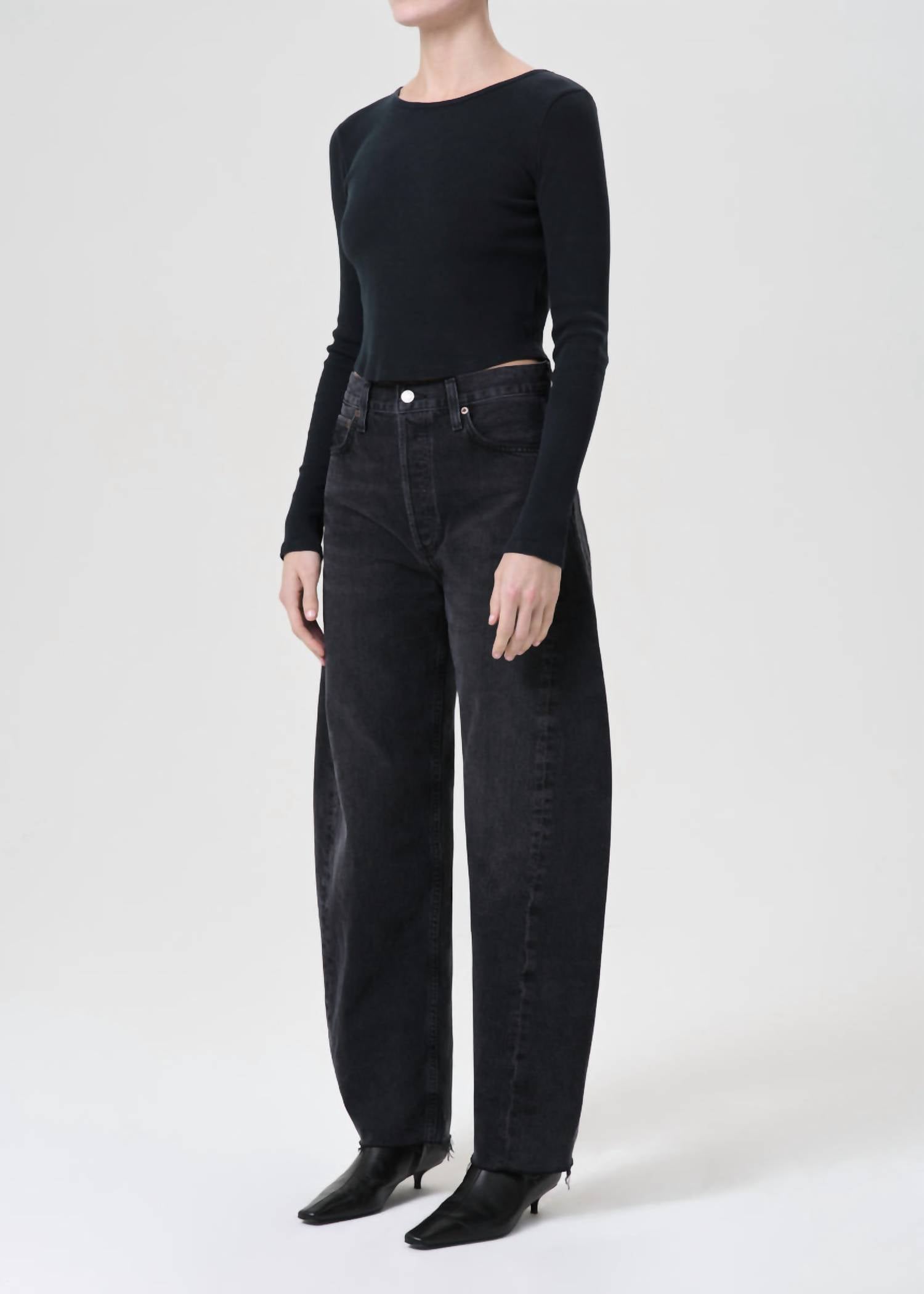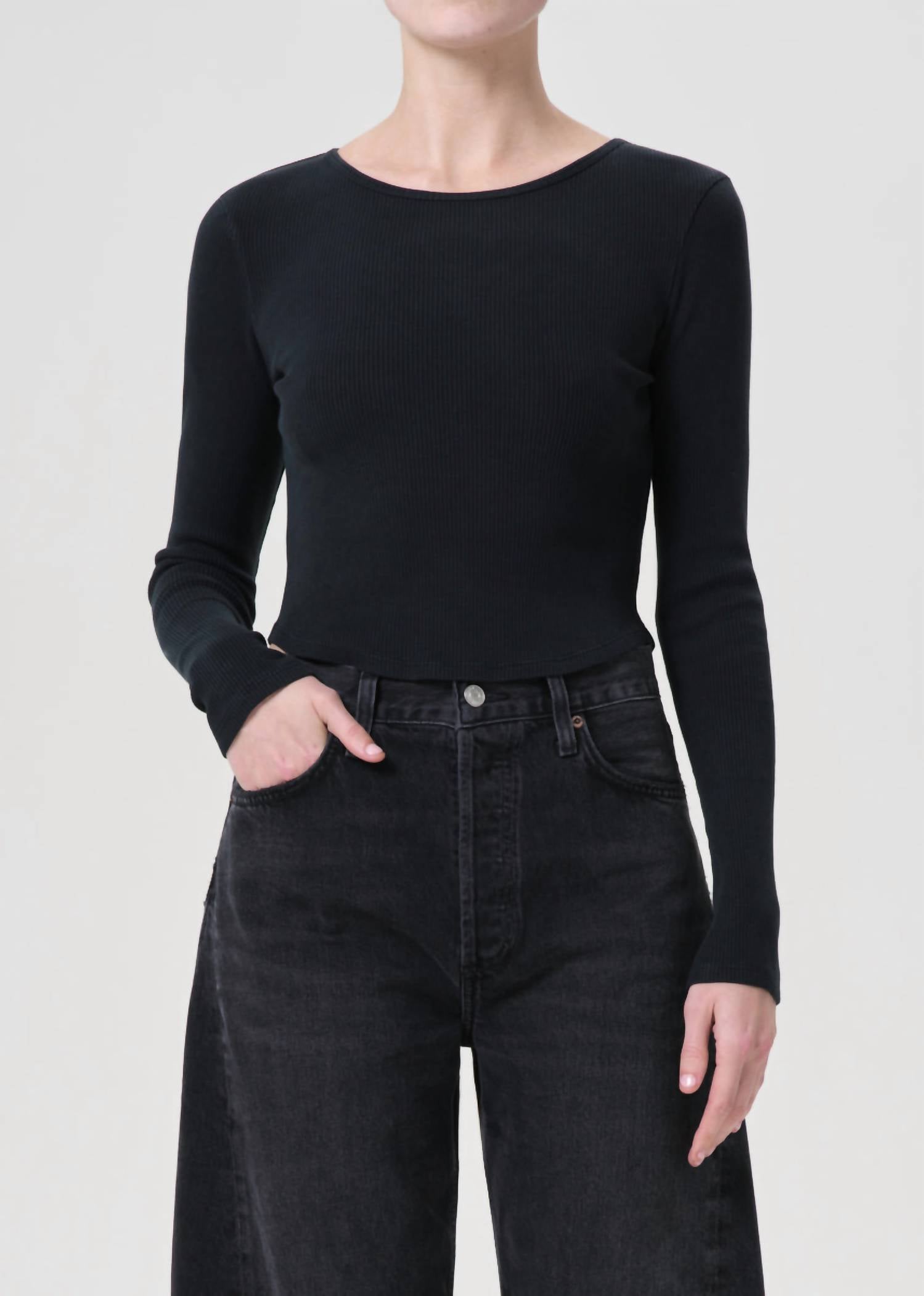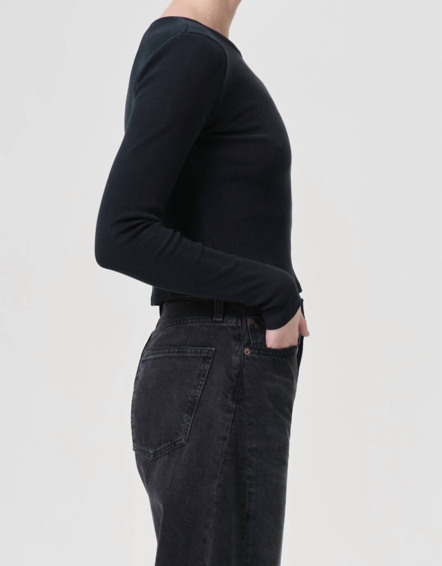 The perfect long sleeve tee that goes with just about anything. Discover the Women's Nova Tee by AGOLDE in a chic beetle hue, featuring a textured design and a crewneck for a stylish yet comfortable fit. Made with long sleeves, this tee pairs effortlessly with denim, enriched by its form-fitting ribbed material which remains supportive and breathable. Closure is simplified with a pull-on style. Care involves machine wash, keeping maintenance minimal while ensuring durability.
