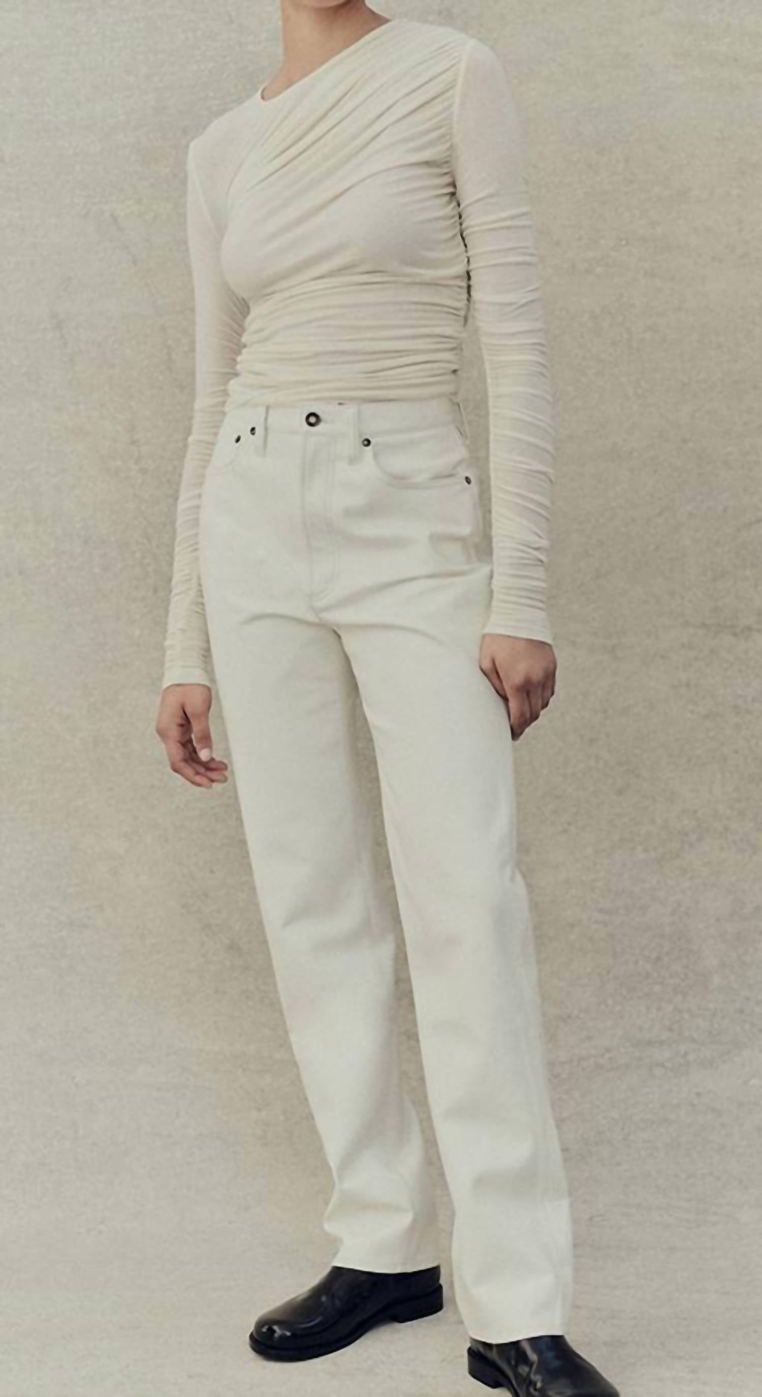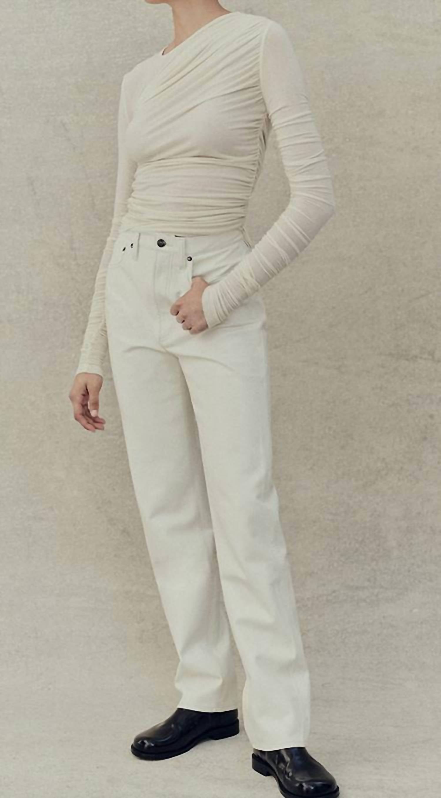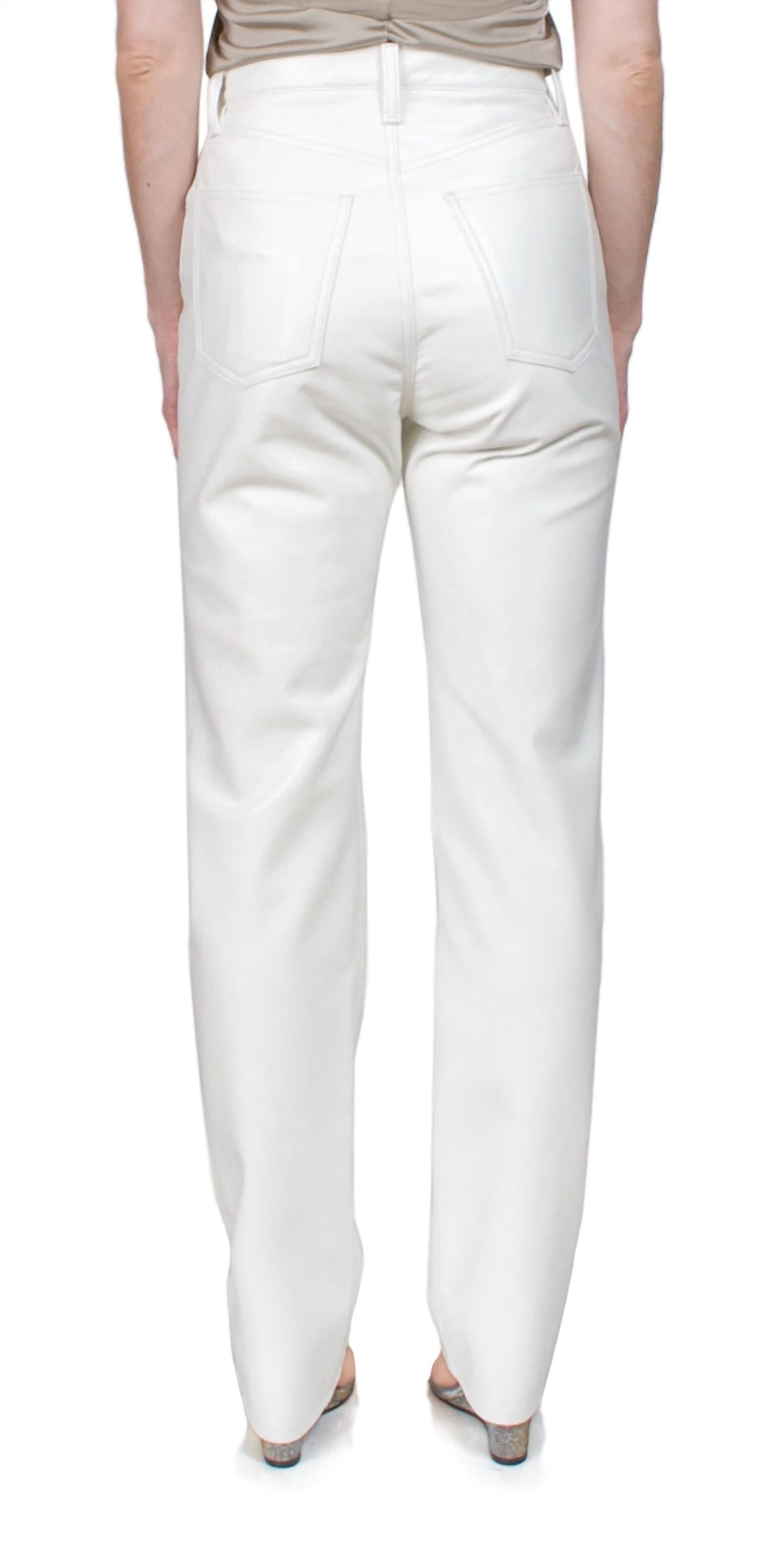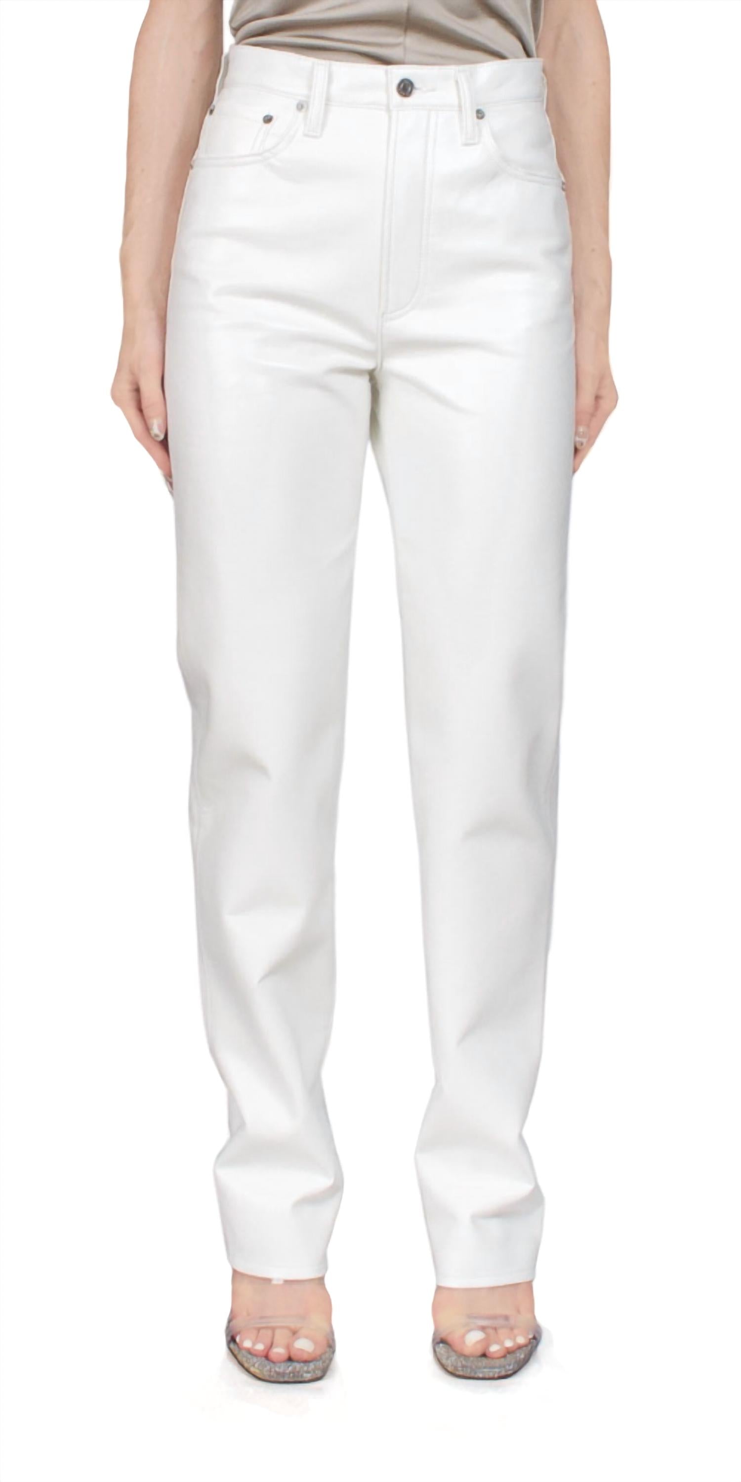 These must-have jeans are fit to perfection. Elevate your outfit with AGOLDE's Women's Recycled Leather 90s Pinch Waist Lace Jeans, crafted for style and sustainability. These jeans feature a high-rise waist with a classic straight-leg design, finished in a luxe eggshell shade called Lace. Composition: 50% Recycled Leather, 30% Polyurethane, 10% Viscose, 10% Polyester. Closure: Zip fly. Made in the USA, with a rise of 12", an inseam of 32", and a leg opening of 15 1/2". Ideal for a chic holiday party, they promise both comfort and a flattering fit, perfect for the fashion-forward woman.
