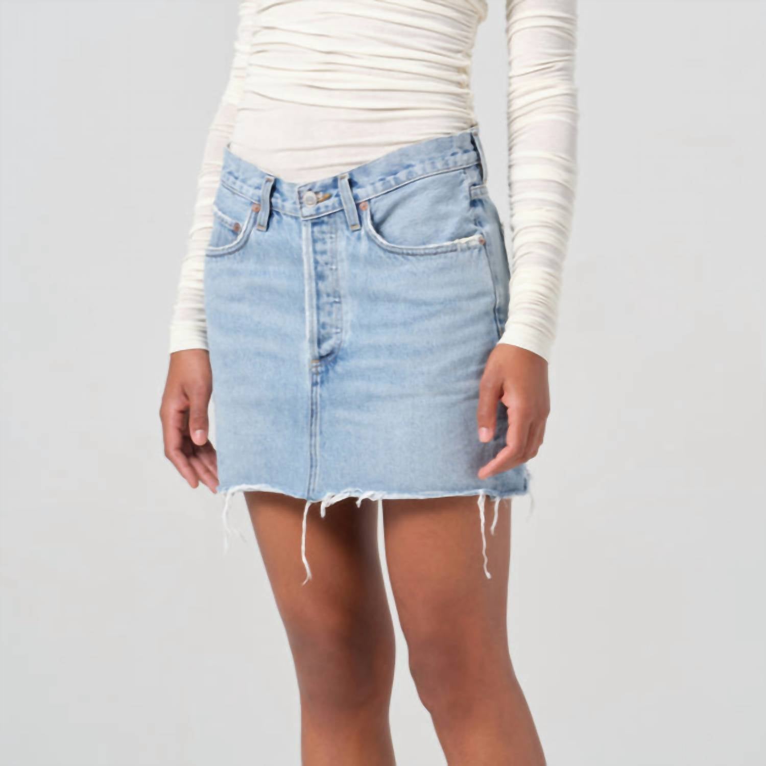 Show just the right amount of leg in this fit flattering mini. Discover the V-Waist Mini Force Skirt by AGOLDE, a striking blue mini skirt crafted from 100% regenerative cotton. This piece boasts a flattering V-shaped waistband, providing a structured silhouette that cinches the waist perfectly. It features a vintage-inspired marbled light indigo denim look, complemented by fading and whiskering details. Closure: Button Fly. Care: Machine wash for easy maintenance. Perfectly suited for spring streetwear style, this skirt offers all-day comfort with a soft hand feel, ideal for vacation dressing. Model is 5'10" and is wearing a Size 27.