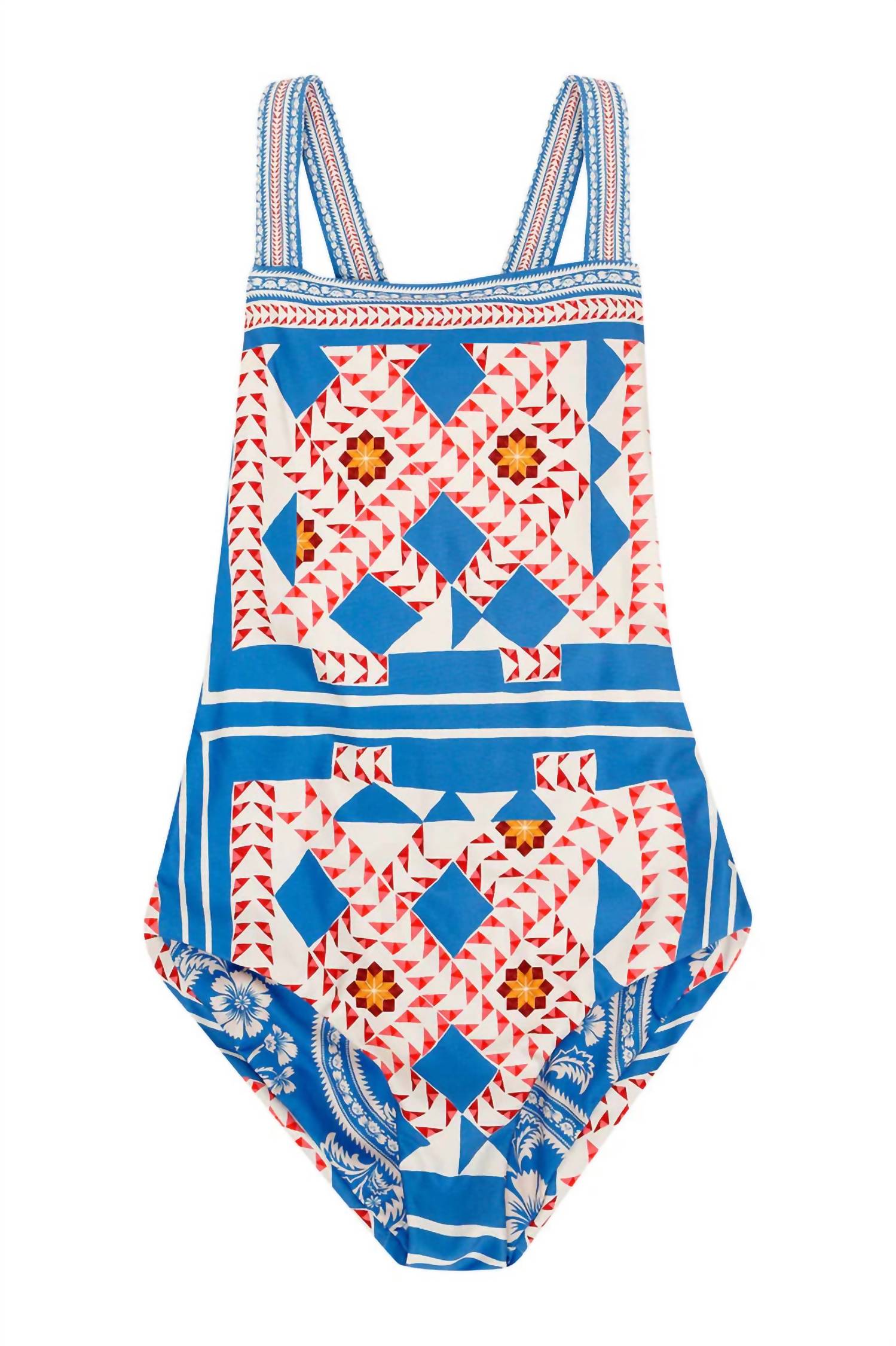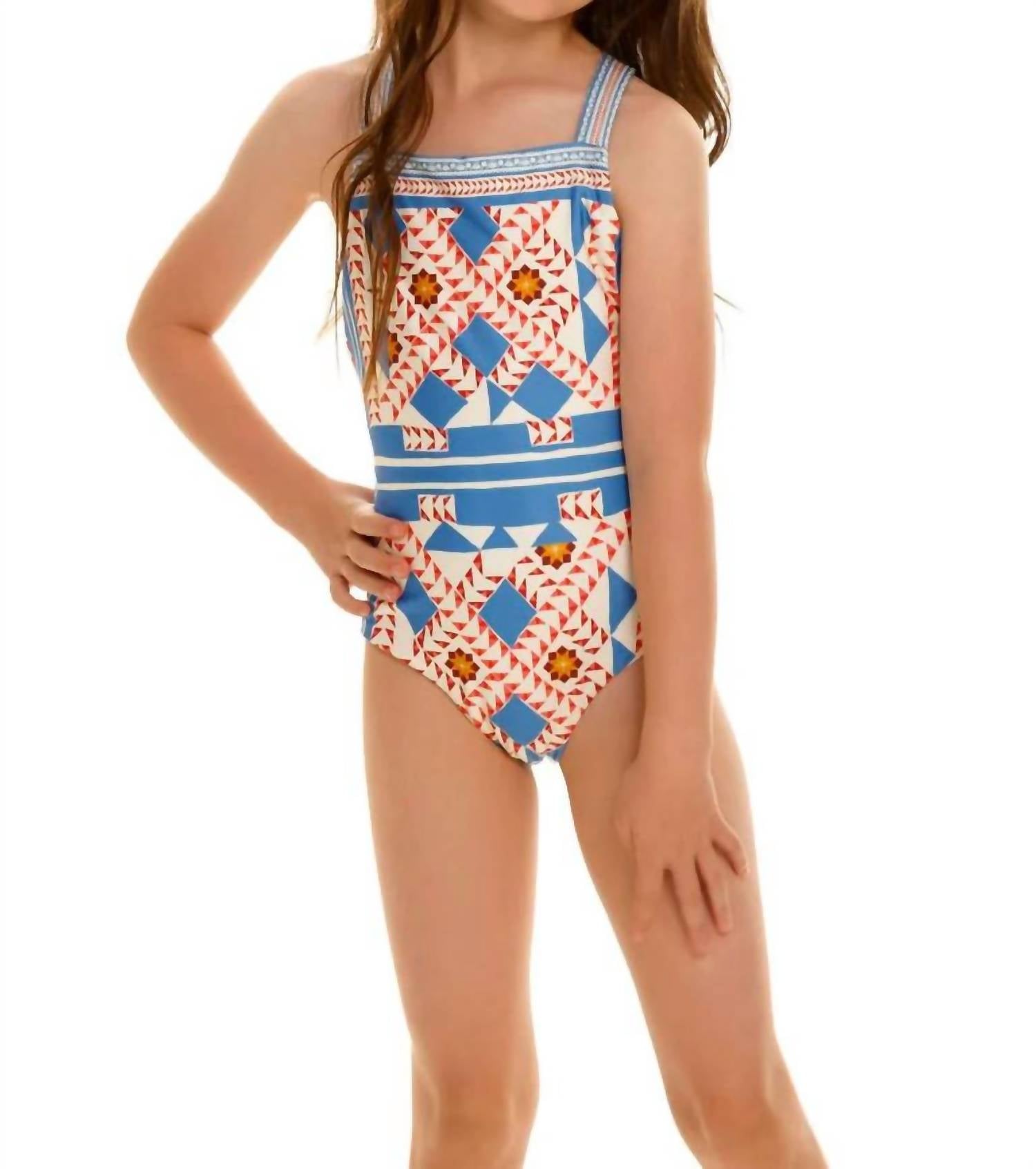Introducing the Agua Bendita Girl's Amina Tout One Piece, a beautifully patterned swimsuit in striking blue designed for a sustainable and stylish beach day. This criss-cross back one-piece offers full coverage for comfort without compromising on style. Made from polyester in Colombia, this piece features localized prints that stand out, creating a unique vintage trend look. Care instructions: Hand wash and line dry. Model is wearing size 8.