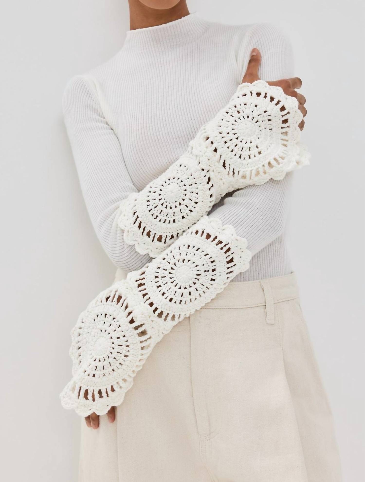 Layer under your favorite sweater or wear tucked into jeans for a perfectly polished winter look. Discover the Mosaic Crochet Detail Knit by Aje., a sophisticated women's piece in elegant ivory. This long sleeve top features a mock neck and exquisite crochet bell cuffs, made from a lightweight ribbed knit with a shell of 100% merino wool and trim of 100% cotton. It secures with a simple pull-on style and measures a flattering 21.75 inches in length. Crafted in China, this patterned turtleneck requires dry cleaning to maintain its pristine condition.