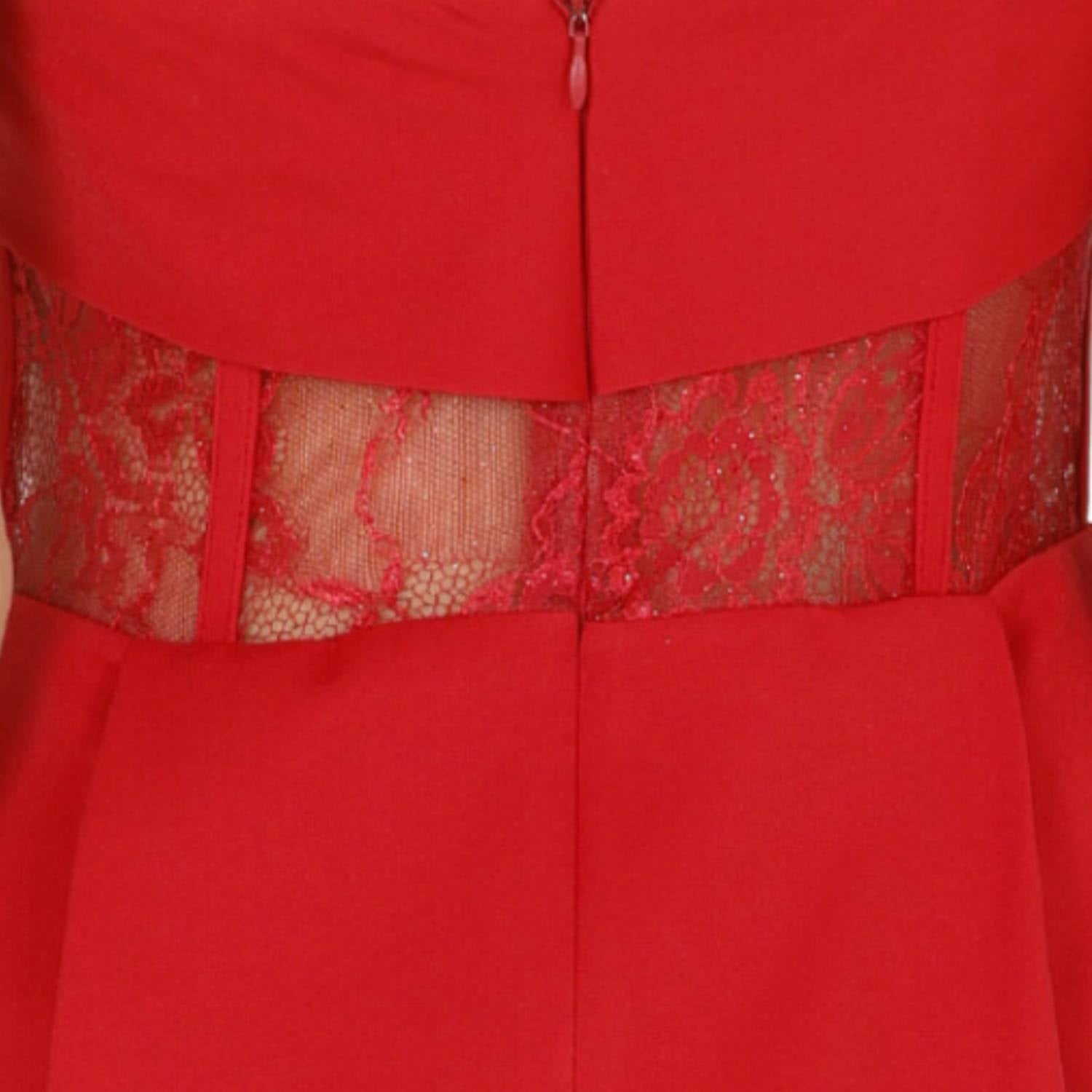 The perfect mini dress for those warmer months. Introducing the Daisy Strapless Lace Corset Dress by Akalia, a captivating piece for your special occasions. This bodycon mini dress in a striking red hue features a strapless design with an off-the-shoulder neckline, offering a modern twist on the classic corset style. Crafted from textured stretch crepe, it highlights a flattering boned bodice and exquisite floral lace trimmings. Proudly made in Turkey, it includes a secure zip closure for easy wear. Perfect for summer celebrations, elevate the look with black stiletto heels and a clutch. Model is wearing size XS.