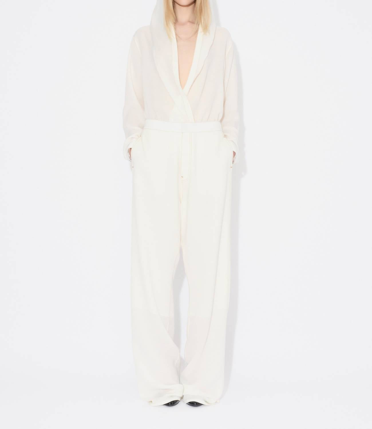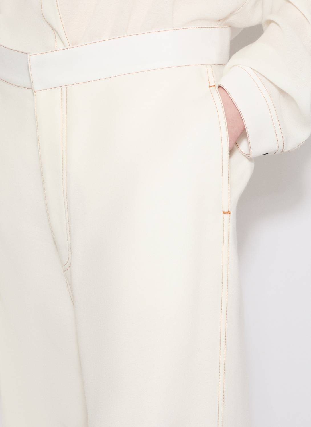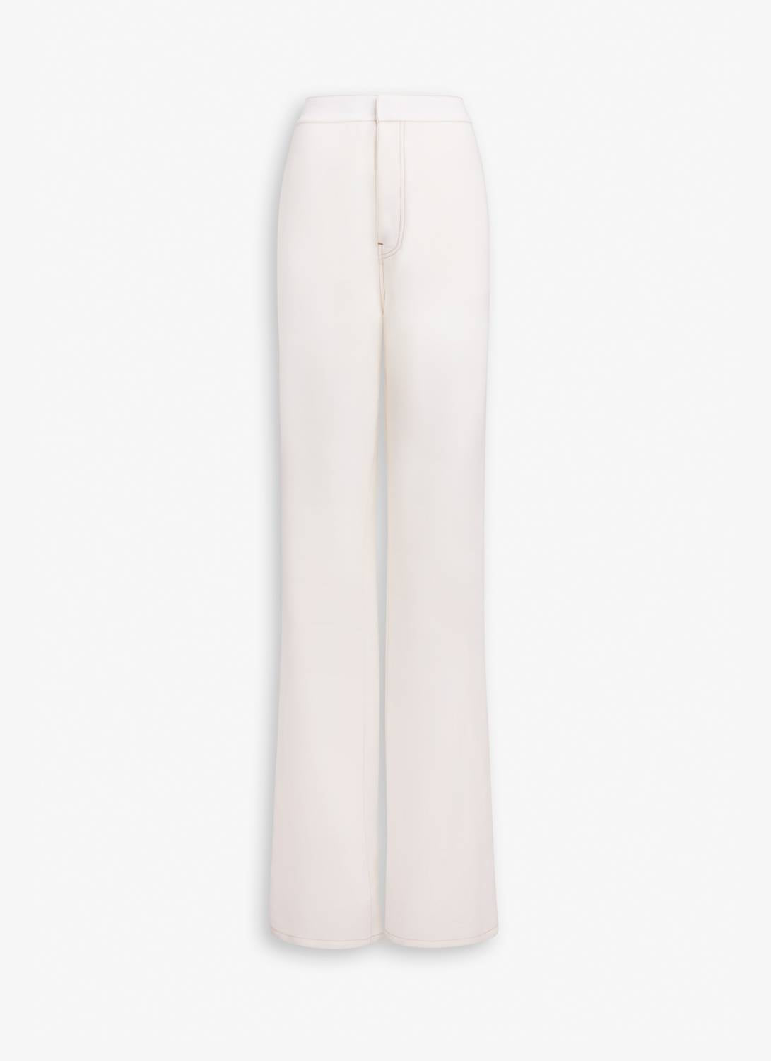 Introducing the Alaia Fluid Pants, a chic addition to your workwear wardrobe in a sophisticated blanc hue. These high-rise tailored trousers feature a thin waistband and flat side pockets, accentuated by contrasting upstitching for a refined look. Crafted from a luxurious wool blend composed of 72% wool and 28% viscose, this piece is meticulously made in Italy. The zip closure ensures ease of wear, and they require dry cleaning.