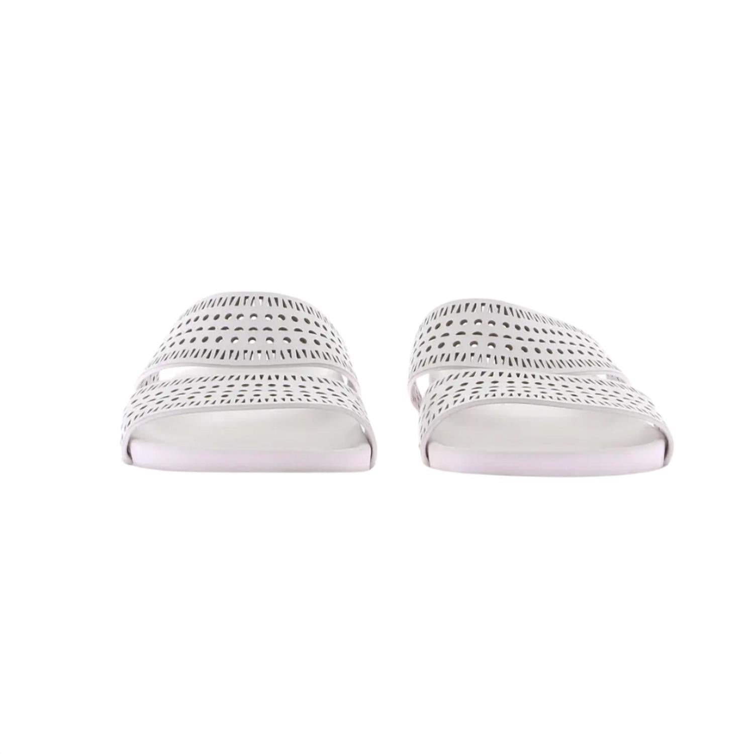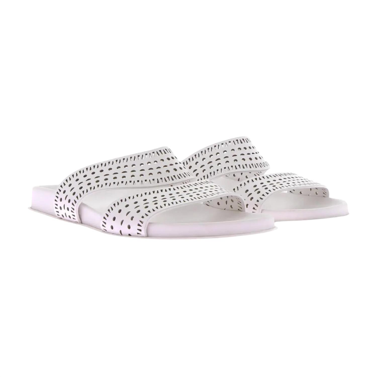 Classicly cute and all-day-wearable. We love this sandal. Introduce chic elegance to your footwear collection with the Women's Leather Mules by ALAÏA. Made from luxurious white calfskin leather, these sandals boast intricate laser-cut perforations for a touch of sophistication. Designed with a flat heel and open toe, they are ideal for summer adventures, whether at the beach or in the city. Perfectly embodying boho chic, these mules complement breezy dresses and linen sets.