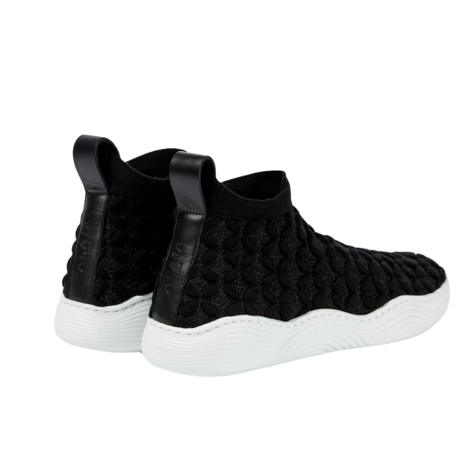 Step up your style game. Crafted in Italy. Boast a signature stretch-knit fabric adorned with the iconic Petale motif, enhanced by leather trim for added luxury. Round toe and rubber sole ensure comfort and durability, making them perfect for transitioning from day errands to evening adventures. Embrace the contemporary fall streetwear trend with these black and white sneakers, ideal for travel and leisurely outings.