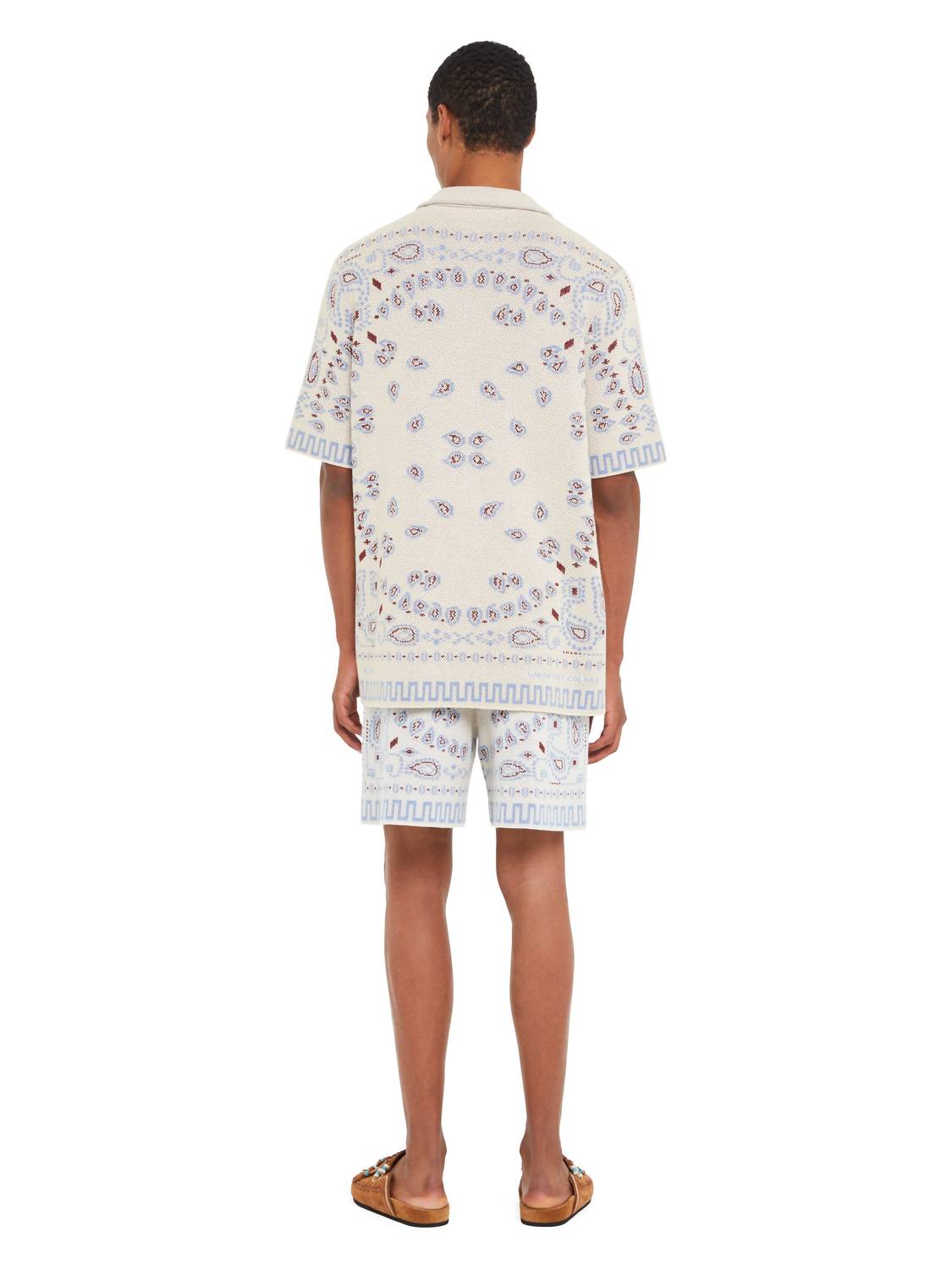 Introducing the Men's Cotton Piquet Bandana Bermuda Shorts by ALANUI, a summer staple in a stylish Chalk/Marsala paisley pattern. These flat front shorts are expertly crafted in Italy from 100% cotton pique using double jacquard knit. Designed with practicality and elegance in mind, they feature a hand-braided drawstring and tassels with a pull-on closure, plus pockets for convenience. Care instructions recommend dry cleaning to maintain their quality and vibrant design.