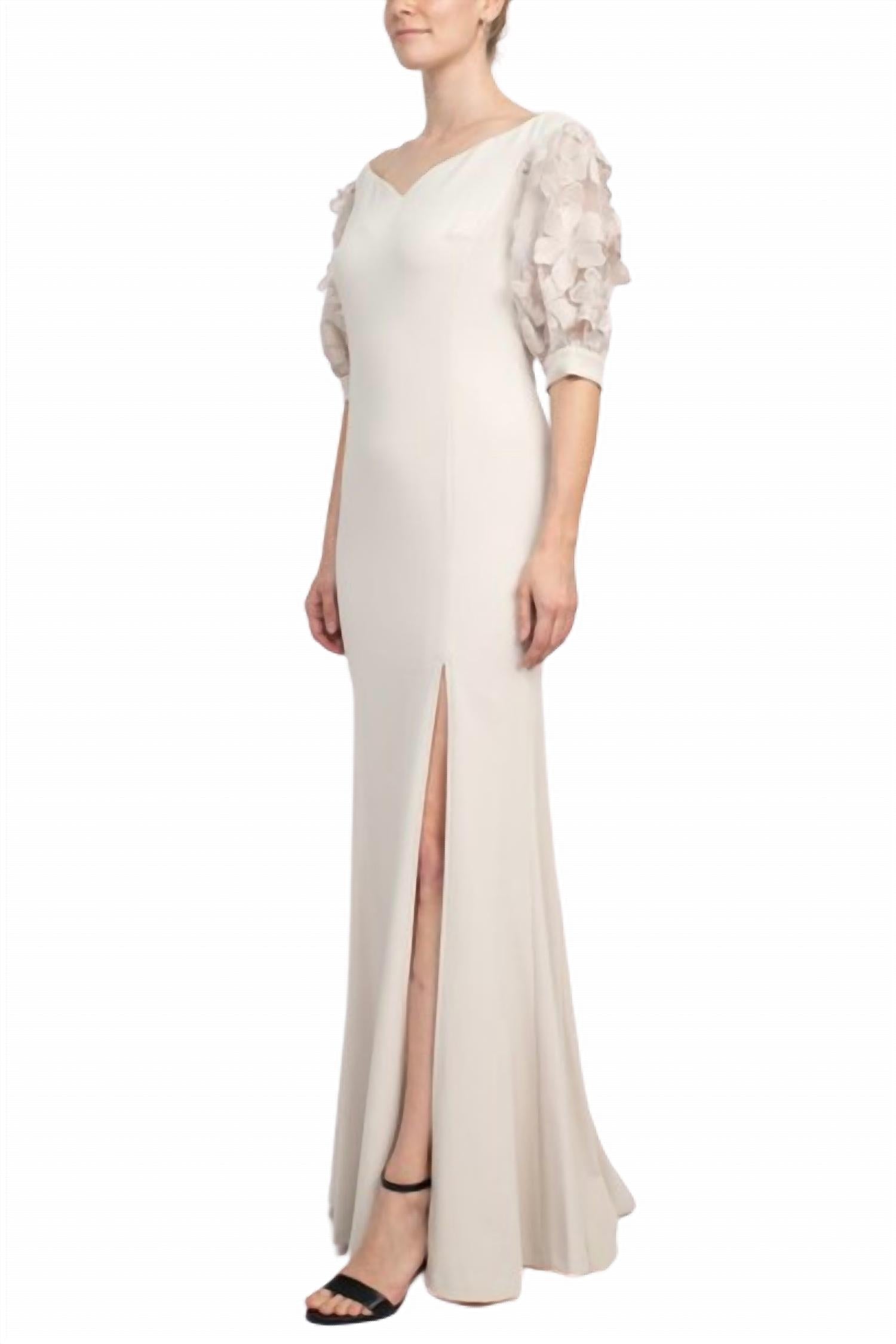 Style this maxi with your favorite statement necklace and sandals for the perfect look. Introducing the ALBERTO MAKALI Embellished Lace Sleeve Mermaid Slit Side Gown, a stunning choice for elegant occasions. With its elbow-length lace sleeves, this taupe gown is crafted from 95% Polyester, 5% Spandex with a sleek lining to ensure both structure and comfort. Designed in a flattering mermaid silhouette, it highlights curves beautifully and features a side slit for added movement. Proudly created for women who appreciate quiet luxury, the gown secures with a back zip closure and requires dry cleaning to maintain its exquisite design.
