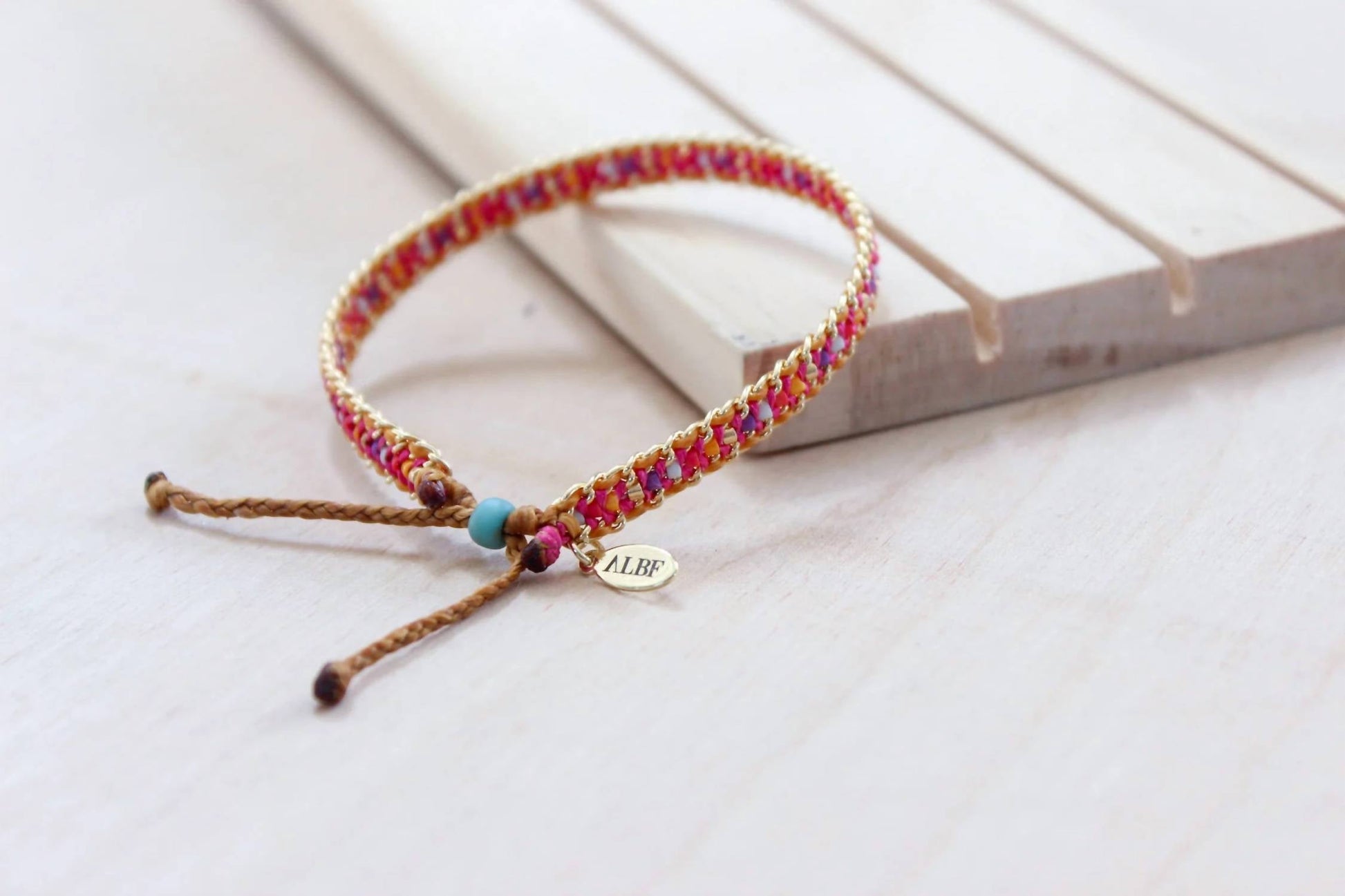 Introducing the Apple of My Eye Braided Bracelet by ALBF Studio, a vibrant multi-colored accessory perfect for kids. This bracelet features a beautiful blend of pink, orange, and purple woven threads paired with gold chains, making it a standout piece whether worn alone or layered with other bracelets. Crafted with Goldtone material and designed to express individual style, this playful piece ensures quality, comfort, and style for the young fashion enthusiasts.