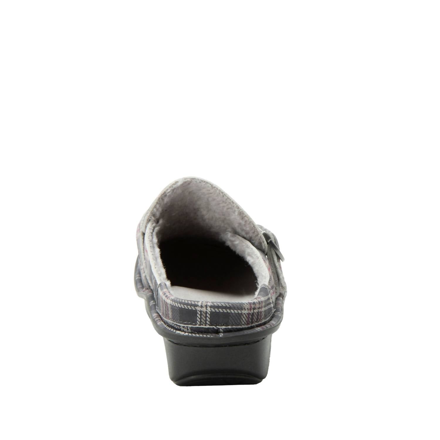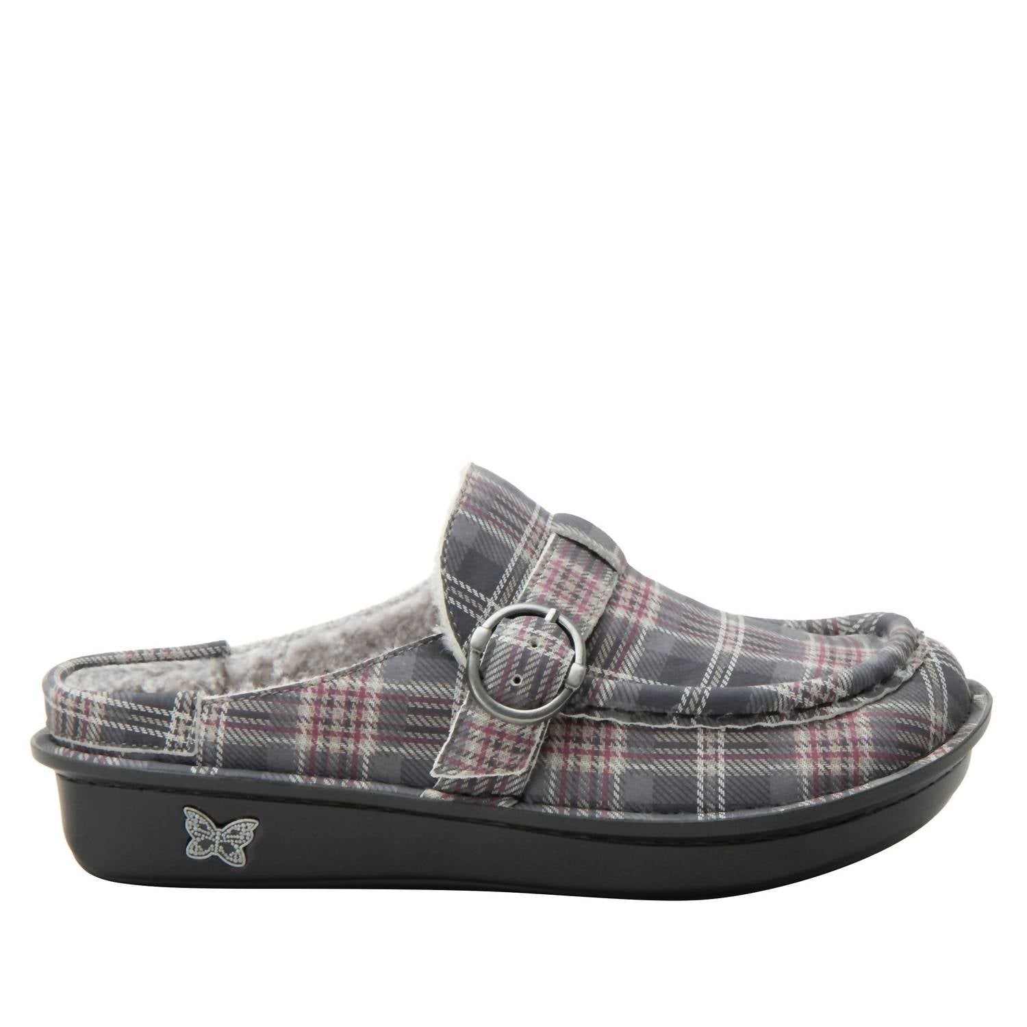 Meet the Women's Brigid Plaid Leather Mules by Alegria, a stylish and comfortable choice for any occasion. These mules showcase a chic plaid design in "Winter Is Coming" with a moc-toe and round toe shape, offering both flair and stability with their adjustable buckle strap and cupped heel lip. The inclusion of a patented removable footbed composed of memory foam and cork ensures ergonomic comfort, complemented by a suede leather footbed. Heel height is a modest 1 inch, perfect for minimalist style trends, and hand-stitched detailing adds a touch of quality craftsmanship.