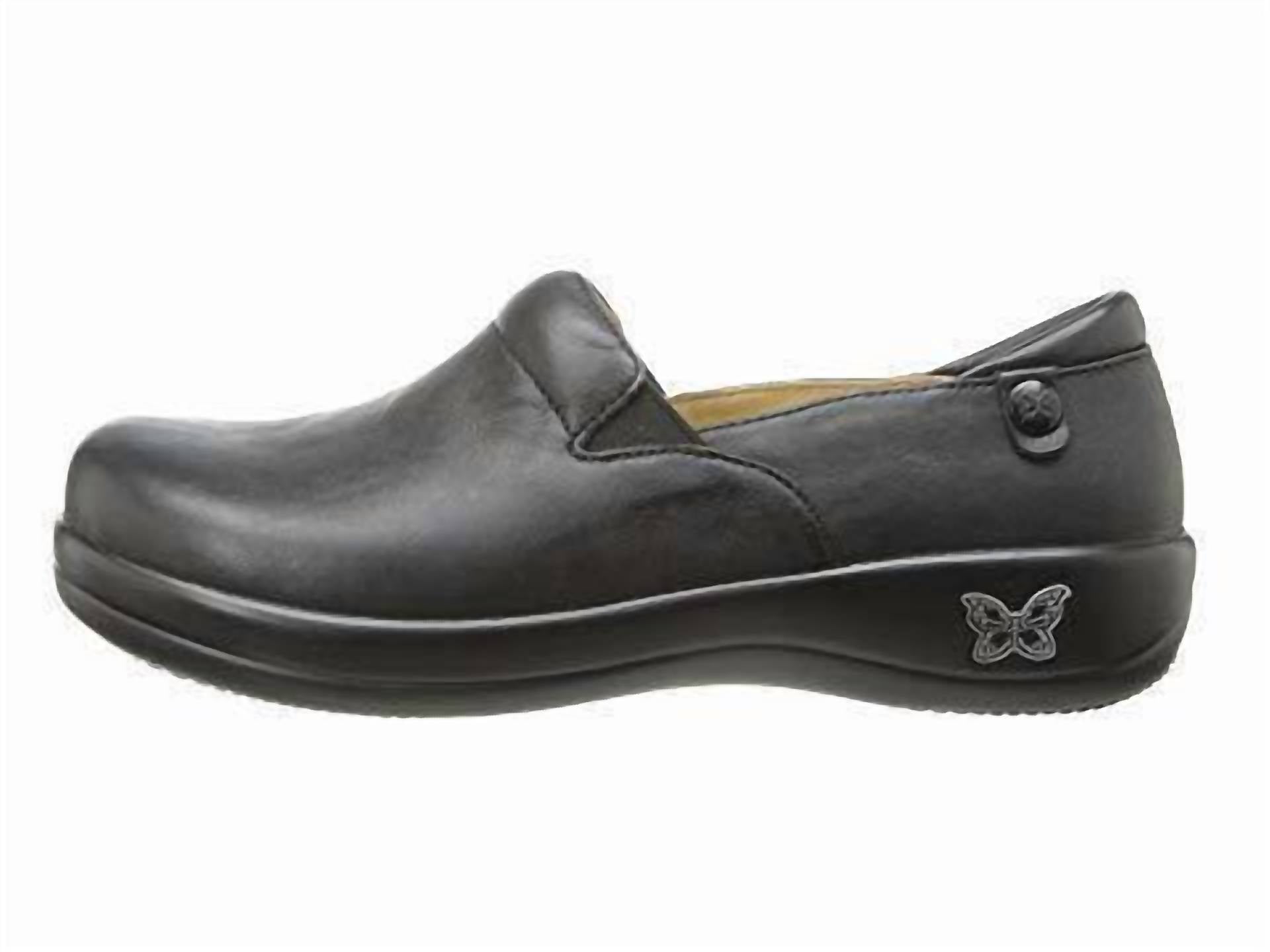 Elevate your professional wardrobe with the Alegria Women's Keli Non Slip Shoe, crafted from genuine black nappa leather. These slip-on shoes feature elastic at the instep for a secure fit and a lab-rated, slip-resistant outsole for safety. The removable leather-covered insole includes cork, memory foam, and latex for superior comfort and arch support, while the hand-sewn construction ensures quality. With a 1-inch heel height and a ¾-inch platform, these shoes offer a lightweight silhouette and plenty of room in the toe box, perfect for both casual wear and occupational settings.
