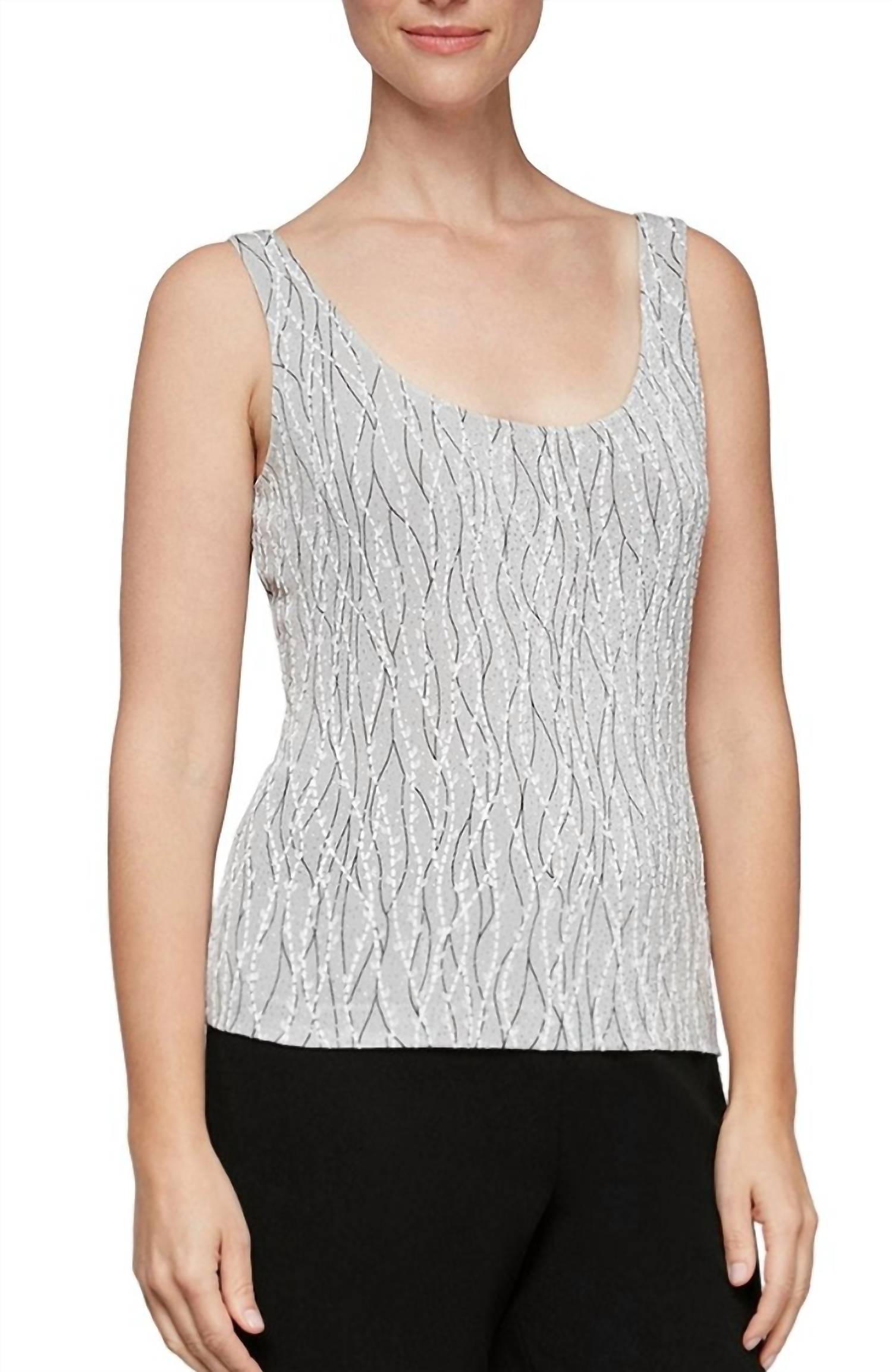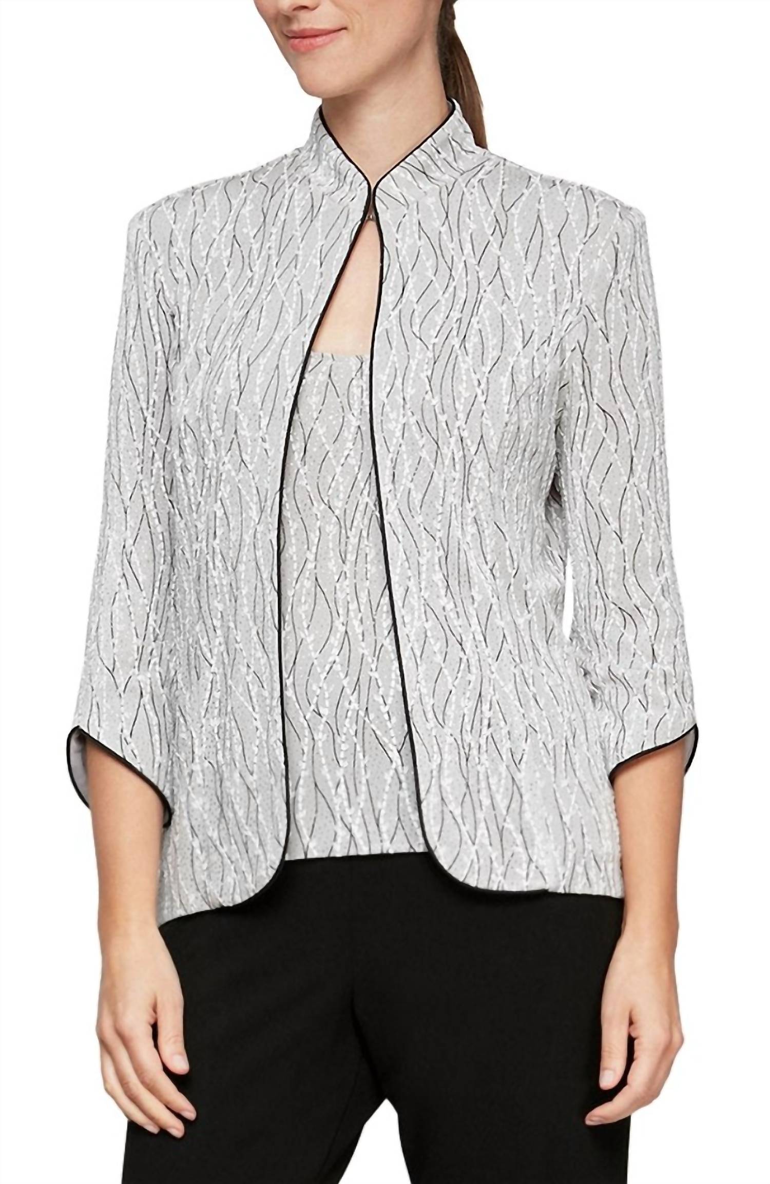 A versatile blouse that works from desk to dinner!Textured Mandarin Collar Twinset—a stylish pairing featuring a botanical print scoop-neck tank with glittery shimmer and a Mandarin-collar jacket. The jacket boasts a front hook-and-eye closure and three-quarter sleeves, offering a bra-friendly design. Crafted with precision in the USA from 90% acetate, 10% spandex, with a 100% polyester contrast, this twinset effortlessly combines sophistication and flair for a chic ensemble.
