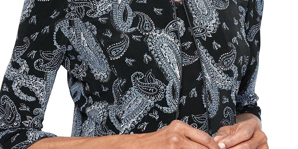 Approx. 15-1/2" long from center back neck to hem|Jacket: mandarin collar, center front hook & eye closure, ¾-sleeves, approx. 23-1/2" long, paisley sparkle print|Scoop neckline|Paisley sparkle print|Acetate/spandex; lining and trim: polyester
