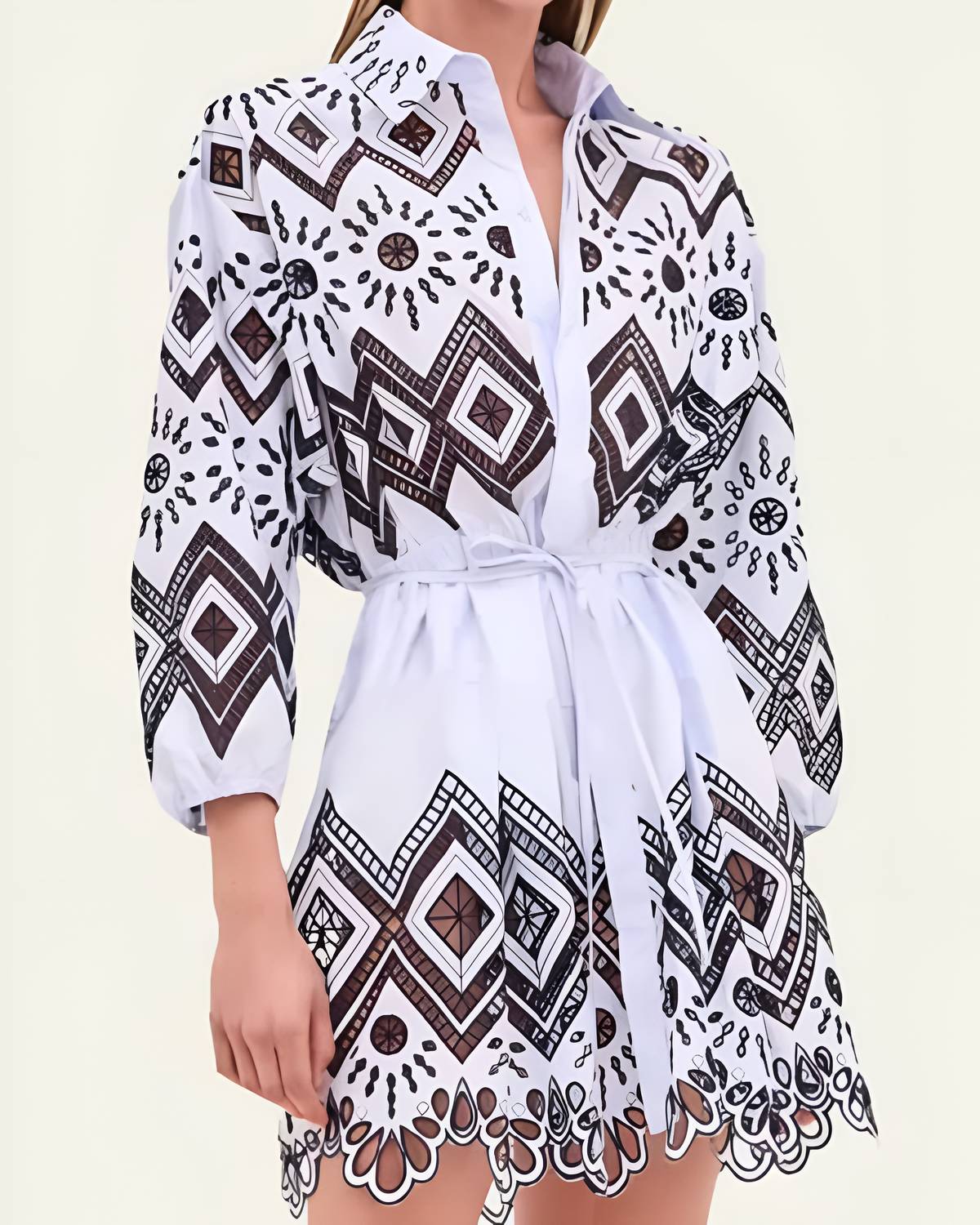 Introducing the Atarra Mini Dress by ALEXIS, a stunning piece perfect for summer occasions. This blue dress features a three-quarter sleeve design, intricate eyelet detailing, and a collar neckline, adding to its Boho Chic appeal. Made from 100% Polyester, it boasts an A-line silhouette with scalloped edges and a cinched drawstring waist, secured with a button closure. For care, please dry clean only.