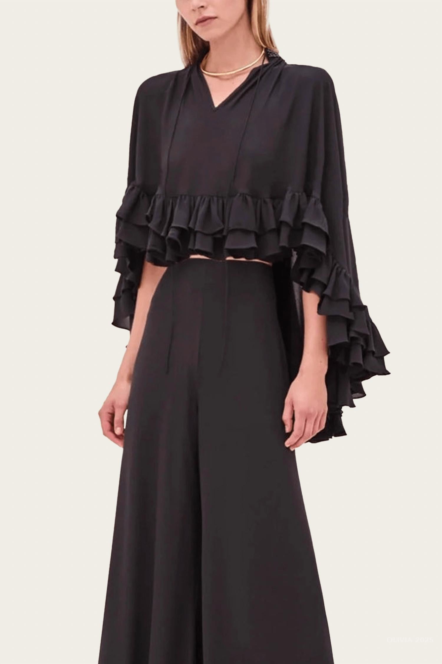 Introducing the Cortese Top by ALEXIS, an elegant high-low blouse in classic black. Crafted from 100% polyester crepe, it features three-quarter sleeves and a stylish front tie-up closure accented with beaded detailing at the collar. This imported piece offers a touch of sophistication with its ruffle detailing. For optimal care, dry clean only.