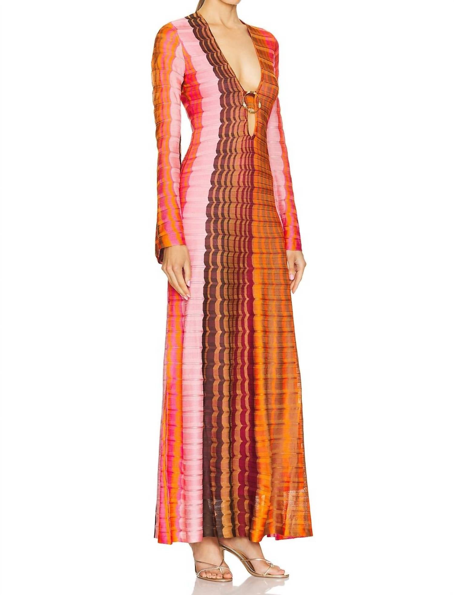 Who doesn't love a good maxi dress? This one you'll be reaching for season after season. Embrace the bohemian spirit with the ALEXIS Vibe Maxi Dress, a stunning choice for any holiday party this summer. Designed with long sleeves and a vibrant orange multi-pattern, this sheath silhouette dress is crafted from luxurious viscose. Its V-neckline enhances the dress’s elegance, while the pull-on closure offers hassle-free wear. Please note, this dress is a final sale item due to the fragility of the knit fabric.