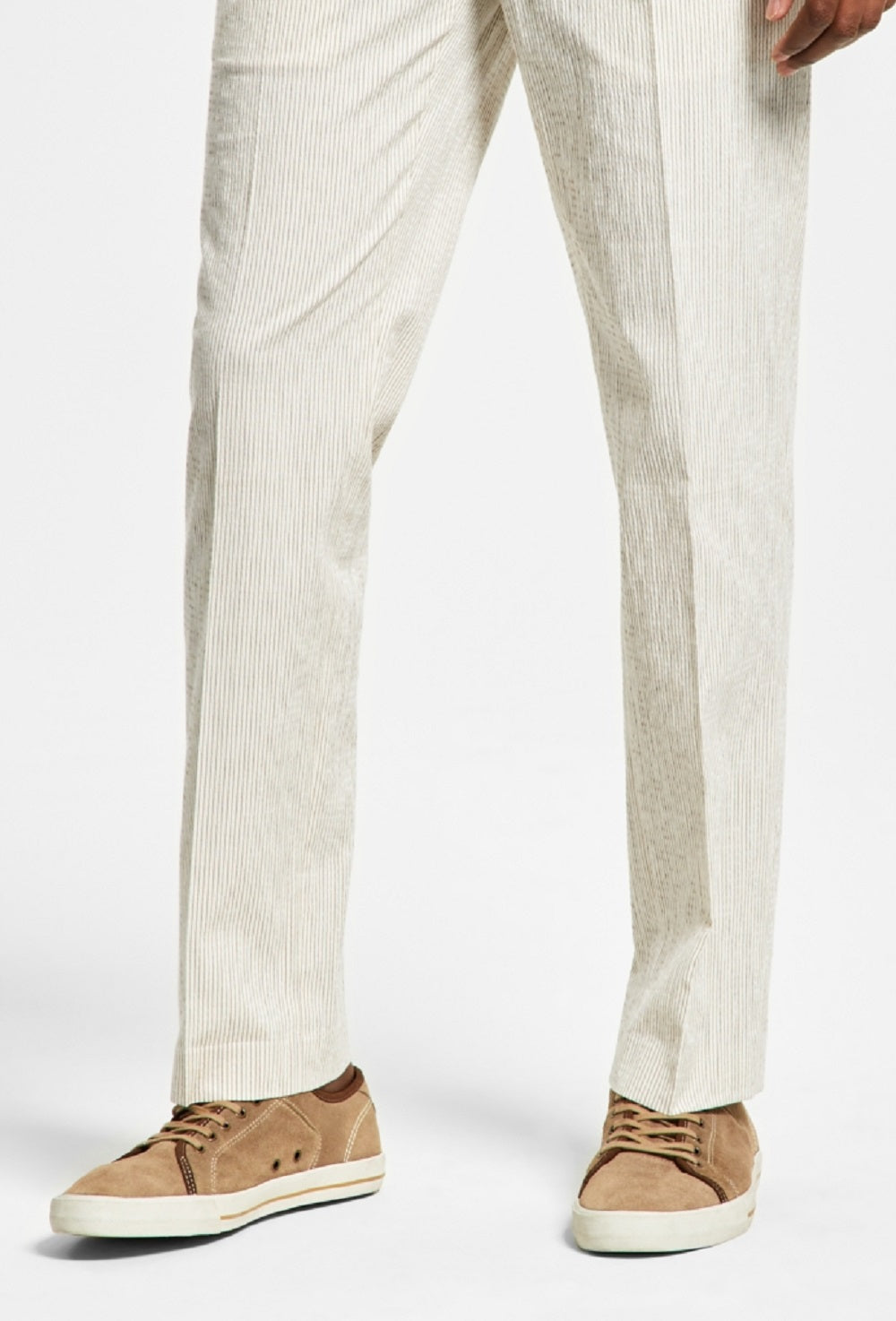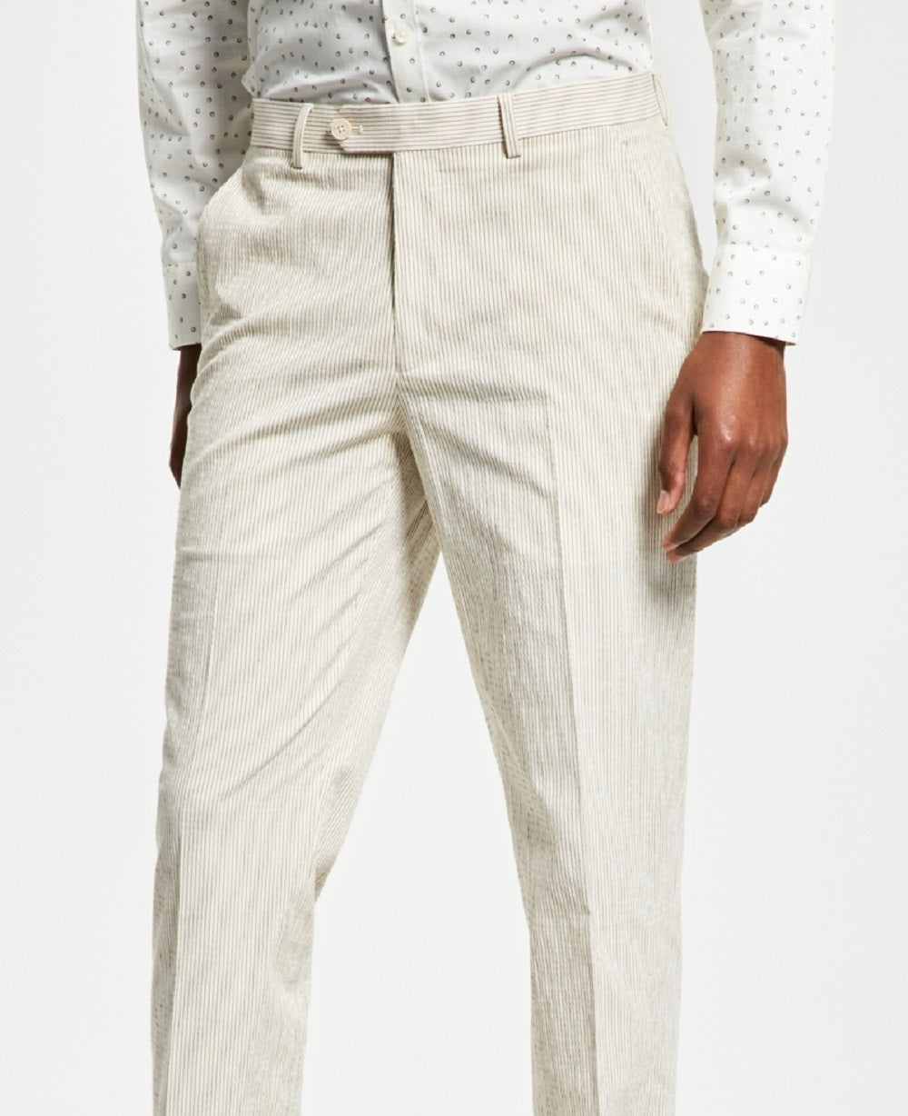 Crisp seersucker fabric and refined stripes make these slim-fit suit pants from Alfani the perfect choice for a fresh formal look