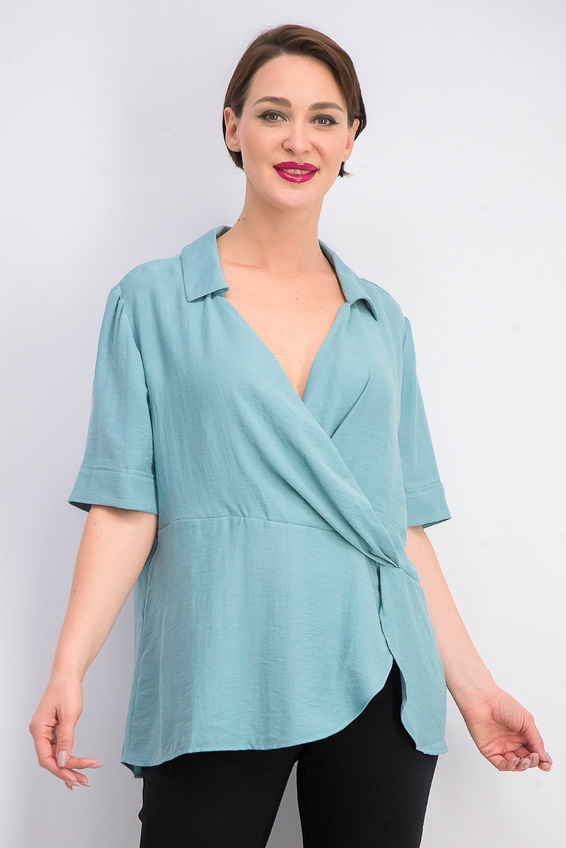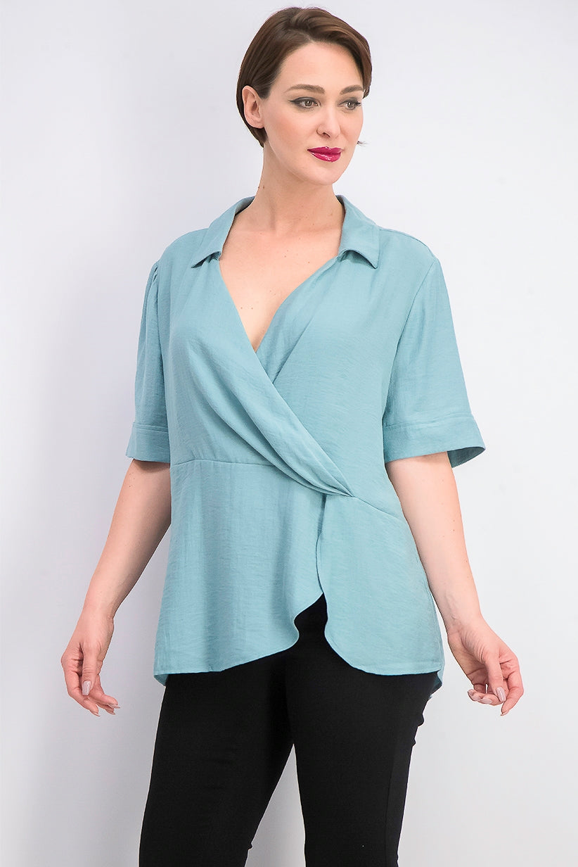 Approx. 27-1/2" long|Surplice neckline with collar|Draped front; textured|Cuffed short sleeves|Rayon/nylon/linen