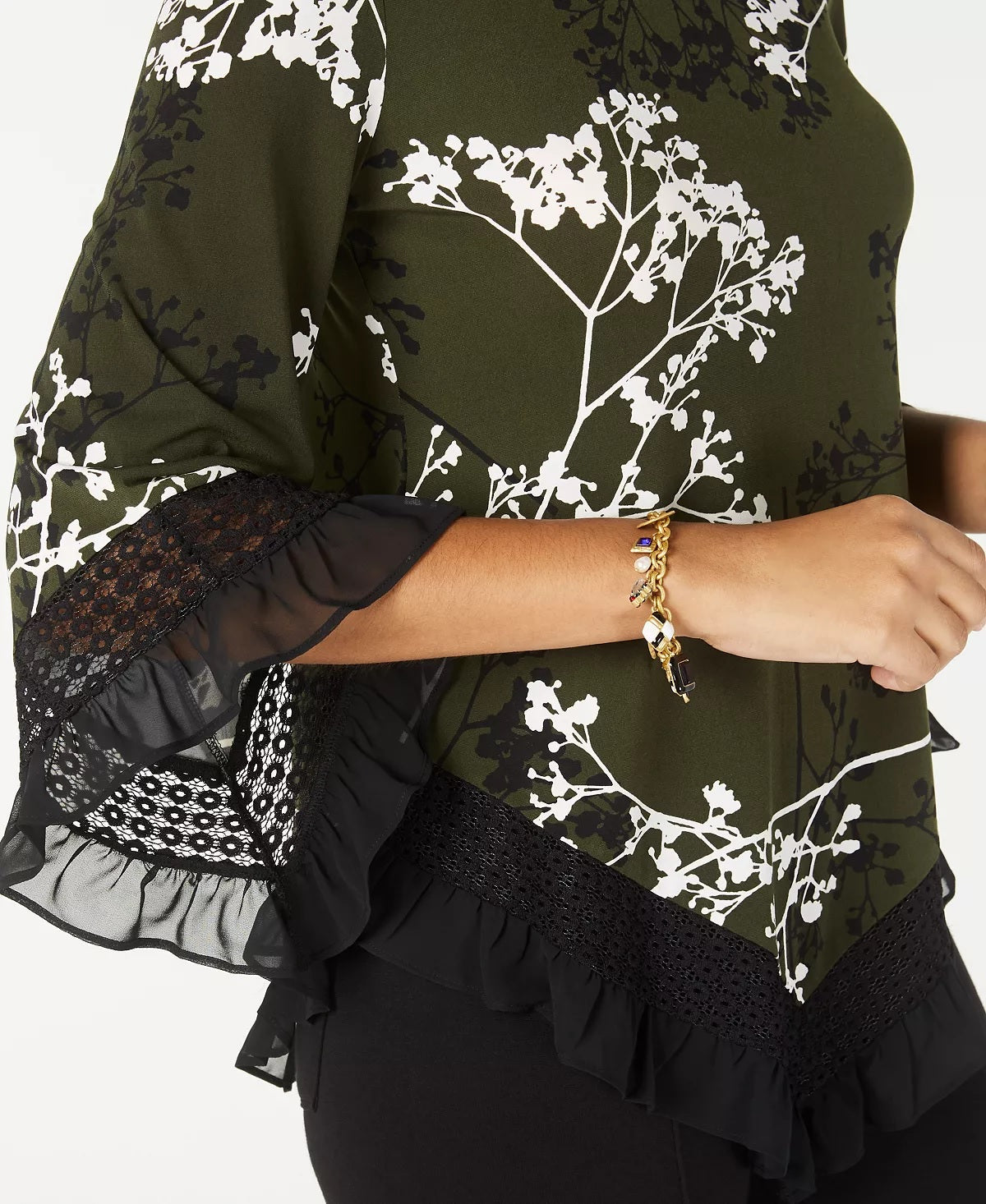 Alfani Women's Floral Print Lace Trim Top Green Size PS