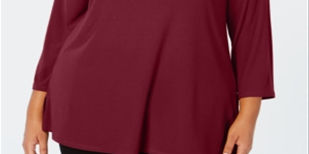 The swingy fit of Alfani's plus size tunic is accentuated with a high-low hem that provides extra coverage in back. The neckline is finished with a buckled strap for a modern touch.| V-neckline| Strap and buckle ornament at keyhole; high-low hem| 3/4-sleeves| Easy fit; hits at low hip|