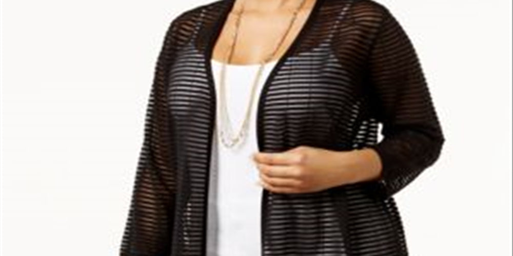 A simple plus size style gets a fashion-forward makeover from Alfani. The elongated silhouette and sheer striped fabric of this open-front cardigan let you layer like a pro.| Open front; no closures | Sheer stripe fabric| Rayon/nylon/polyester| 3/4 sleeves| Easy fit; hits at thigh|