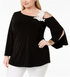 Designed with a one-shouldered neckline| this plus size tunic from Alfani features 3/4-length split bell sleeves and a dramatic lace appliqué on one side. The elongated hem provides extra coverage.| Easy fit; hits at low hip| Asymmetrical neckline| Contrasting lace appliqué at shoulder| 3/4-length split bell sleeves